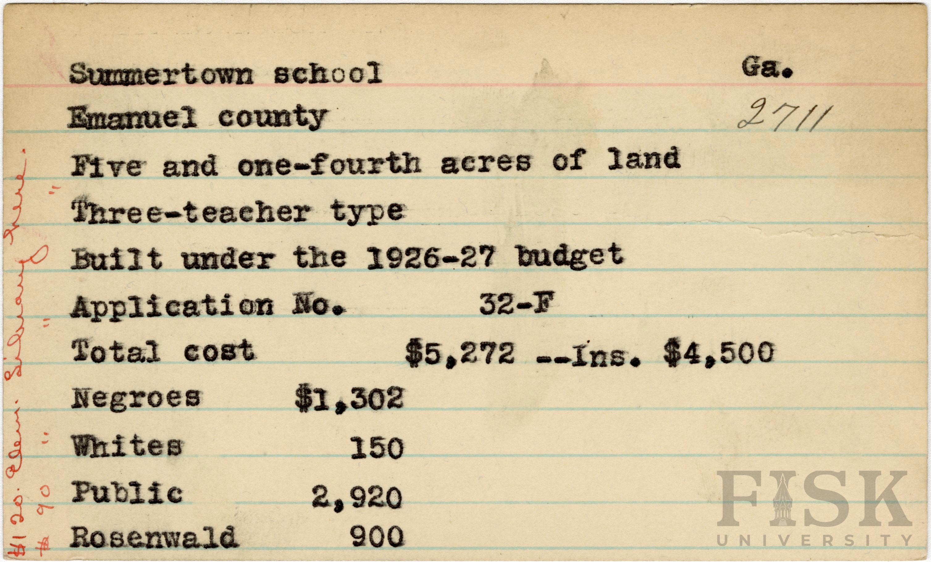 - School card from Rosenwald Fund for Summertown School in Emanuel County, Georgia with a section added to the budget contributions that says, "Ins. $4,500" and handwritten notes on the far left of the card that say, "$120 elem library here" and "$90 elem library here"