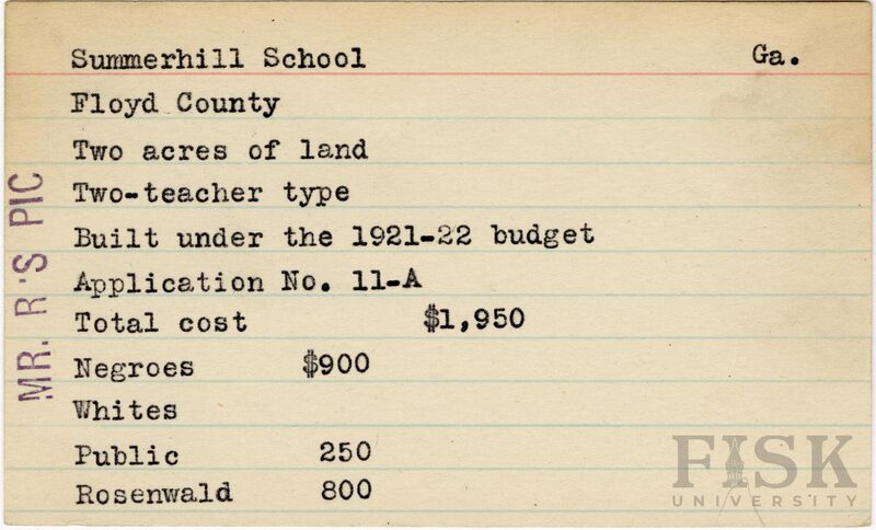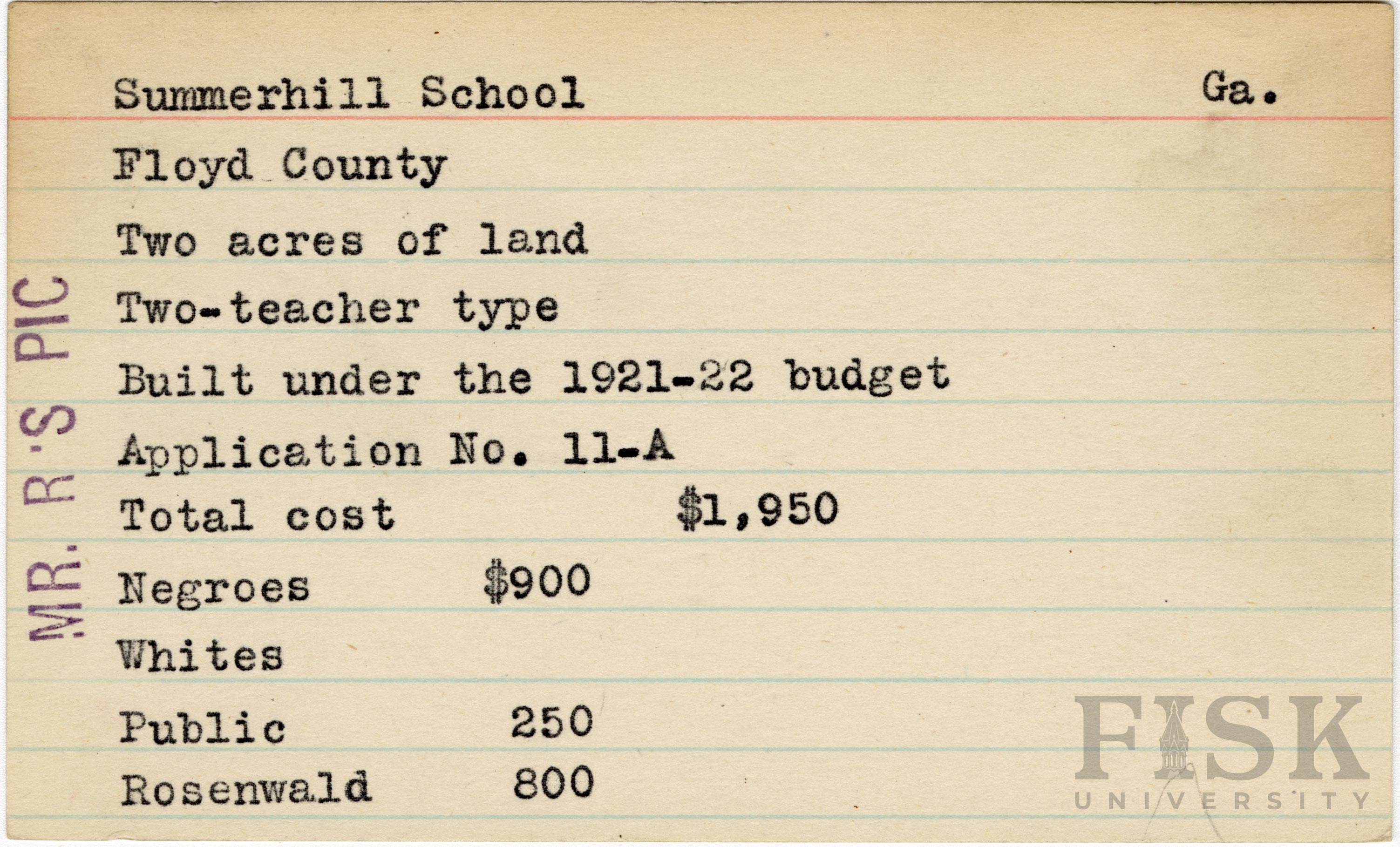 - School card from Rosenwald Fund for Summerhill School in Floyd County, Georgia with a note on the far left of the card that says, "Mr. R's Pic"