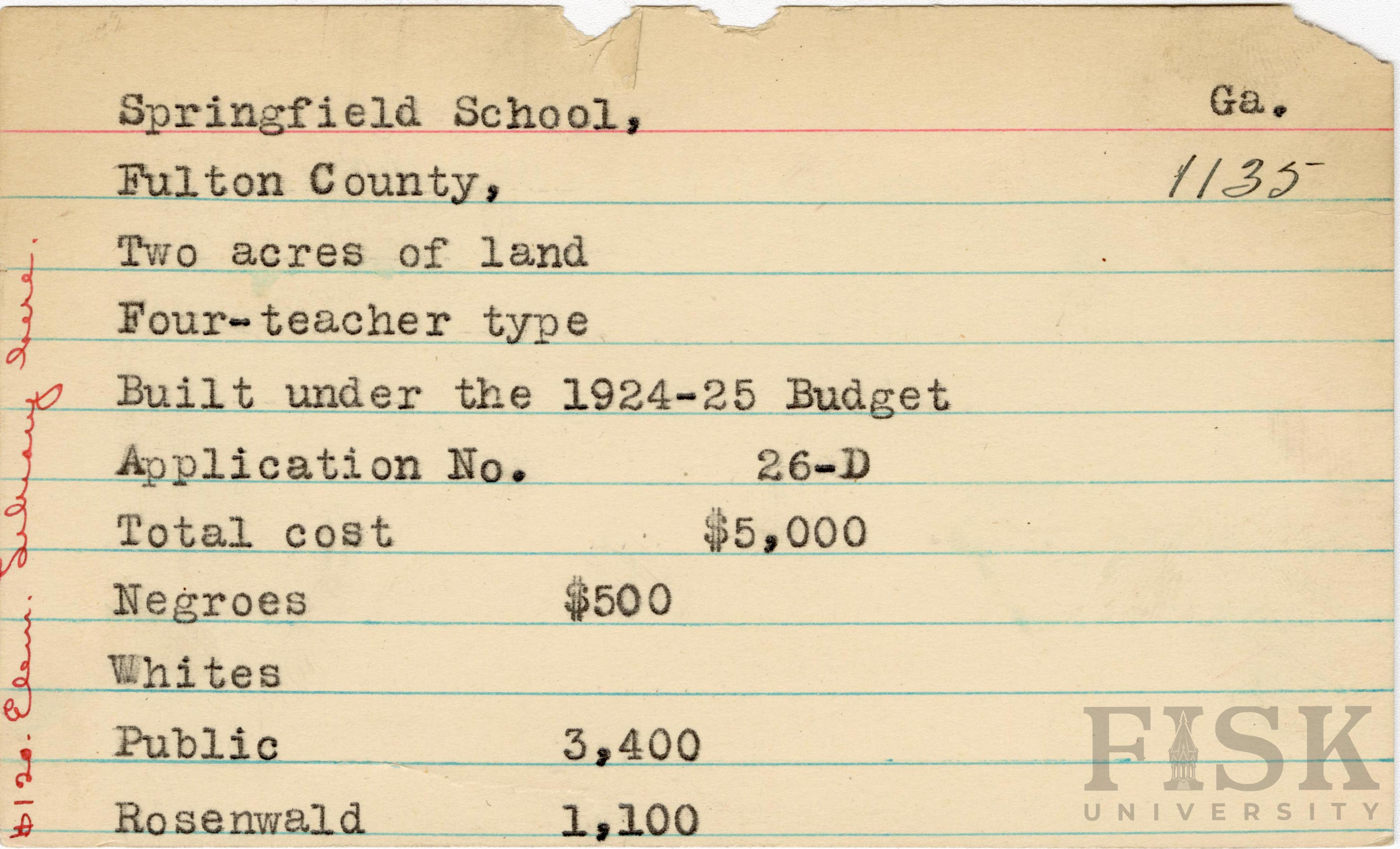School card from Rosenwald Fund for Springfield School in Fulton County, Georgia with a handwritten note on the far left of the card that says, "$120 elem library here"