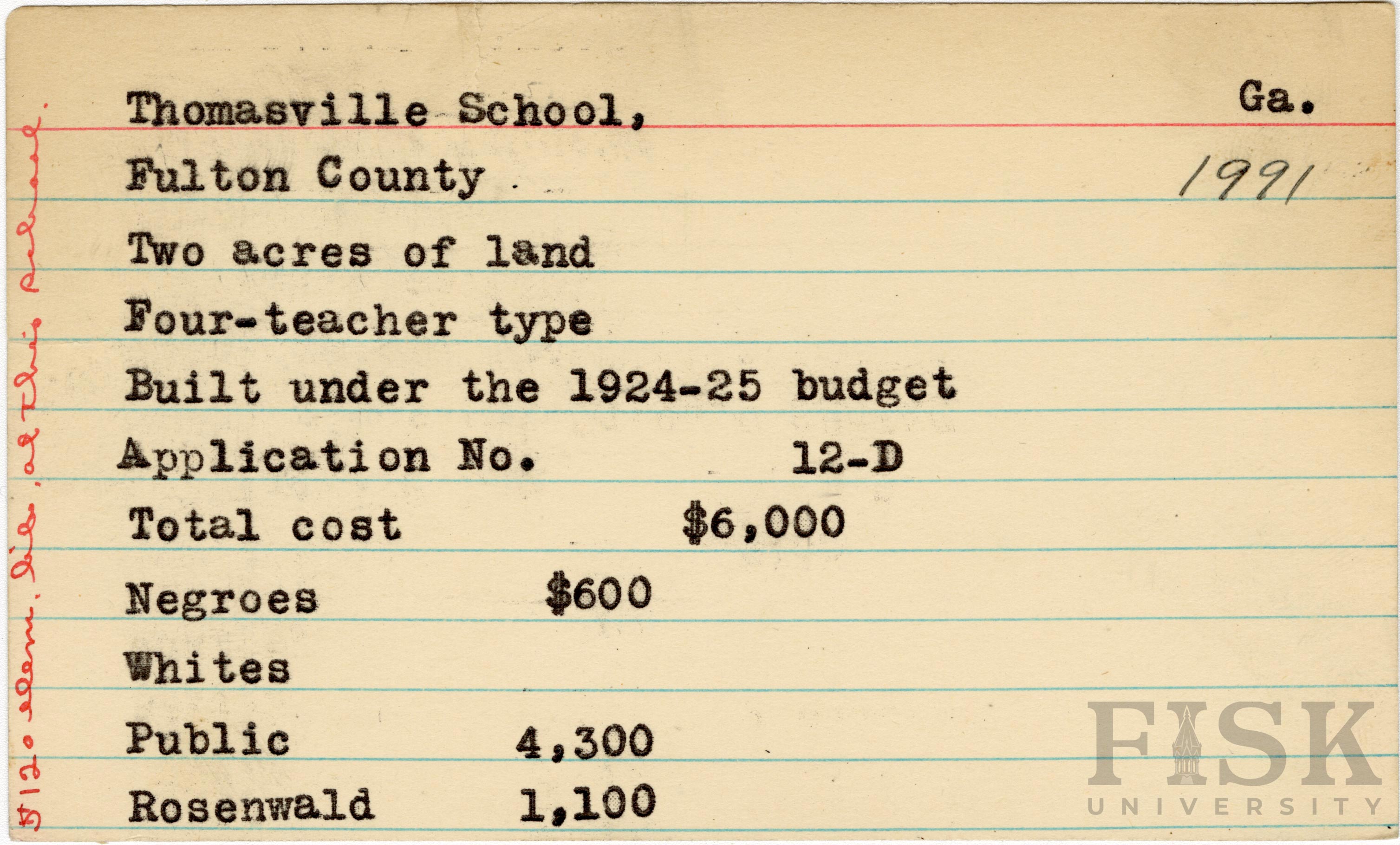 School card from Rosenwald Fund for Thomasville School in Fulton County, Georgia with a handwritten note on the far left of the card that says, "$120 elem lib at this school"