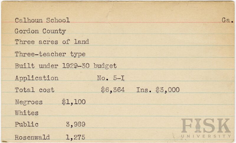- School card from Rosenwald Fund for Calhoun School in Gordon County, Georgia with a section added to the budget contributions that says, "Ins. $3,000"