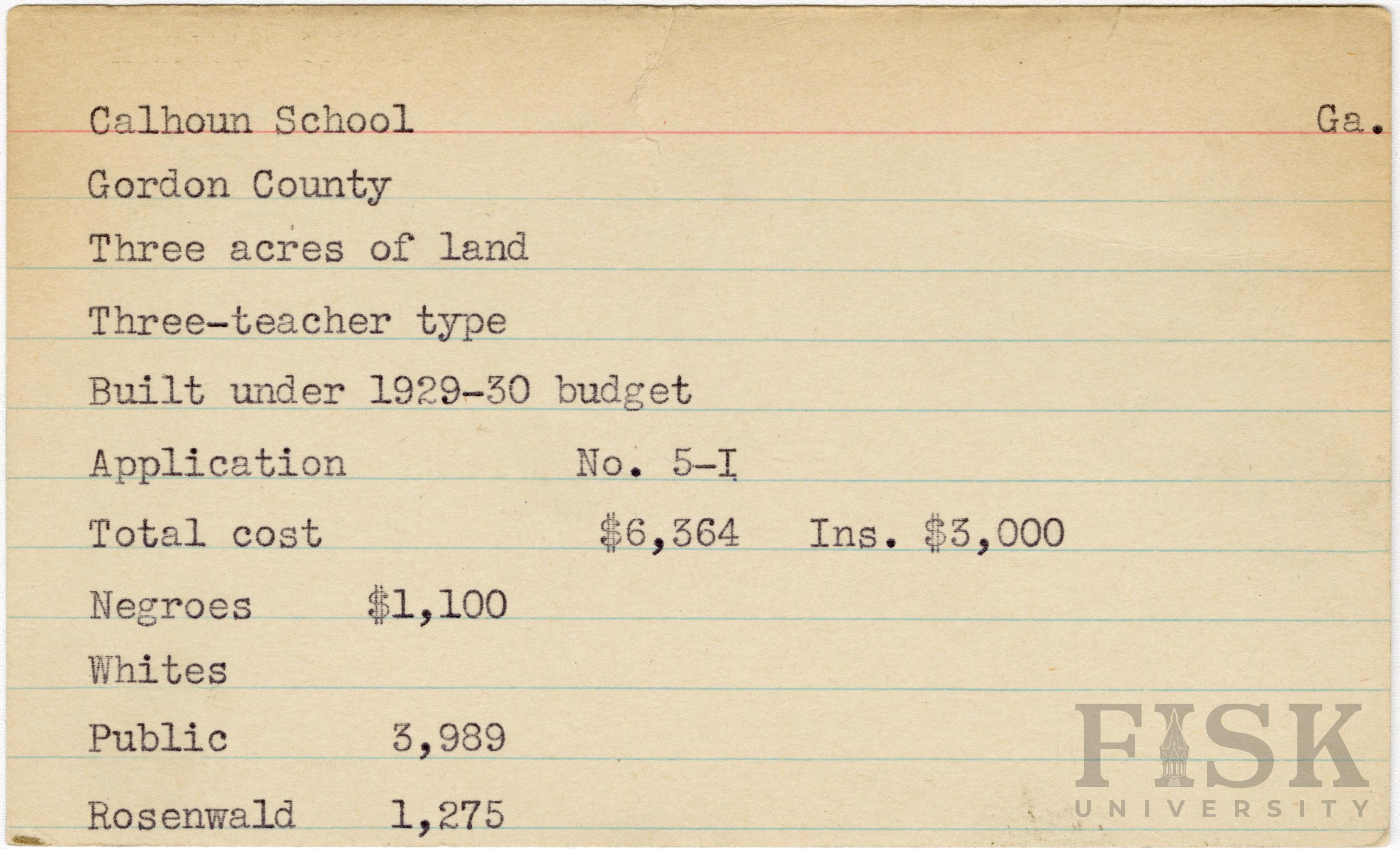 School card from Rosenwald Fund for Calhoun School in Gordon County, Georgia with a section added to the budget contributions that says, "Ins. $3,000"