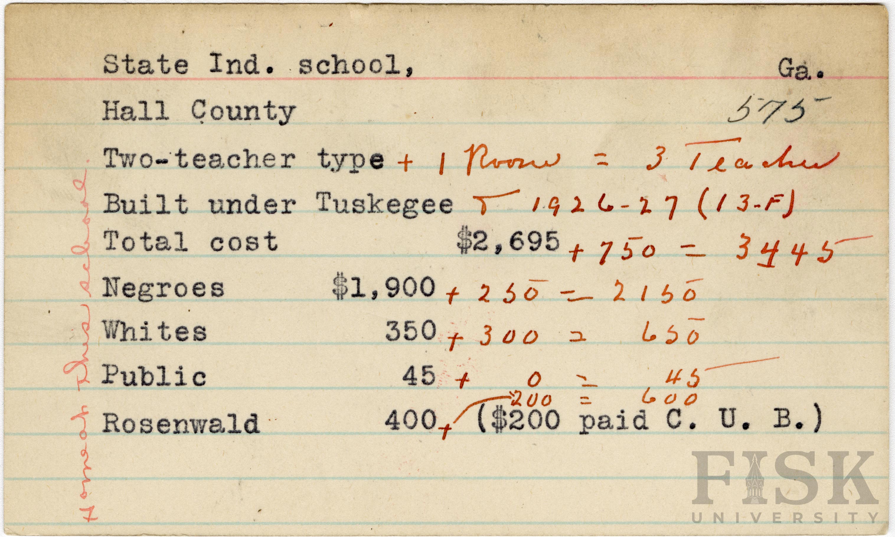 School card from Rosenwald Fund for State Industrial School in Hall County, Georgia with handwritten additions to the teacher type, budget year, and budget contribution sections and a handwritten note on the far left of the card that says, "Home at this school"