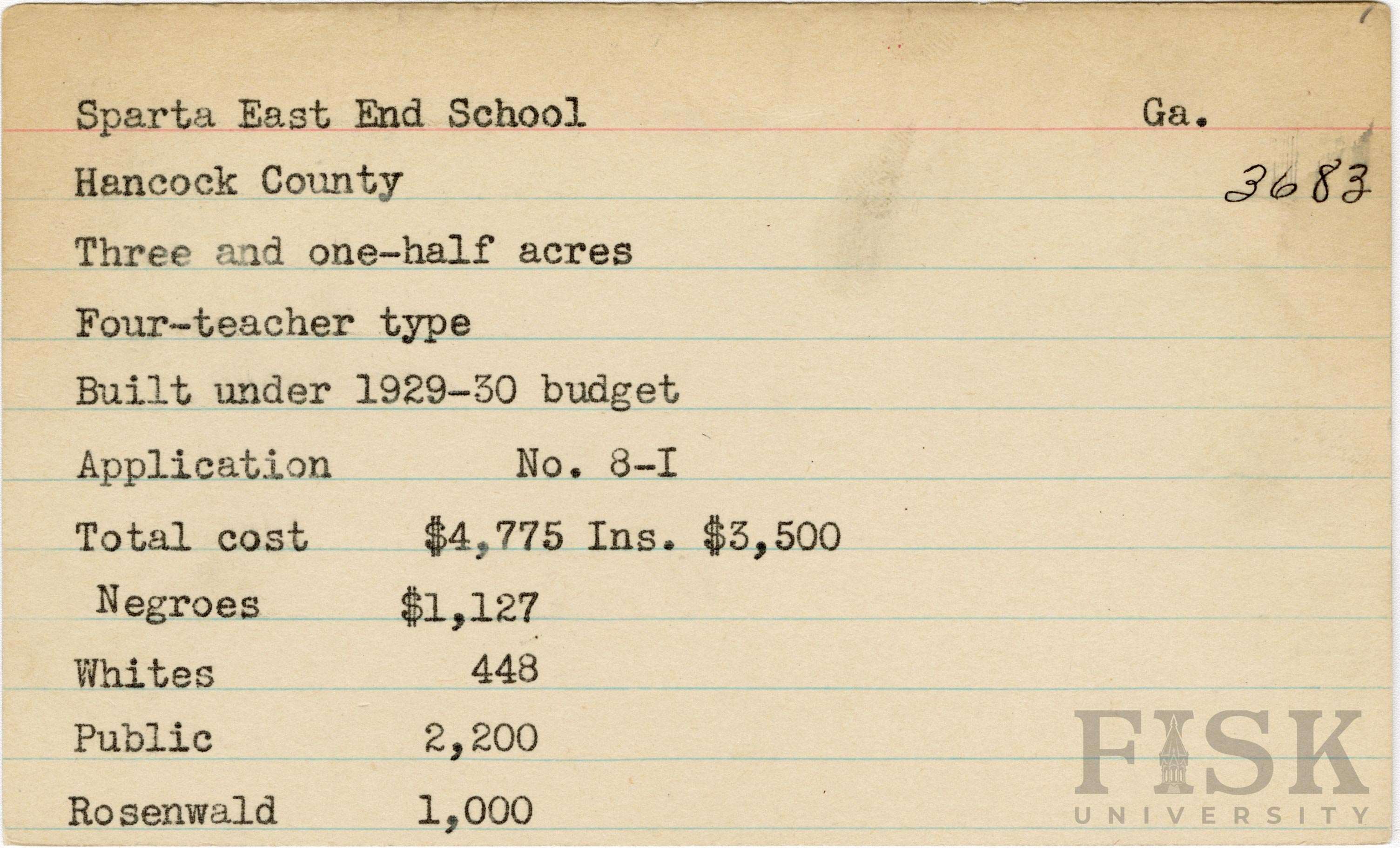 School card from Rosenwald Fund for Sparta East End School in Hancock County, Georgia with a section added to the budget contributions that says, "Ins. $3,500"