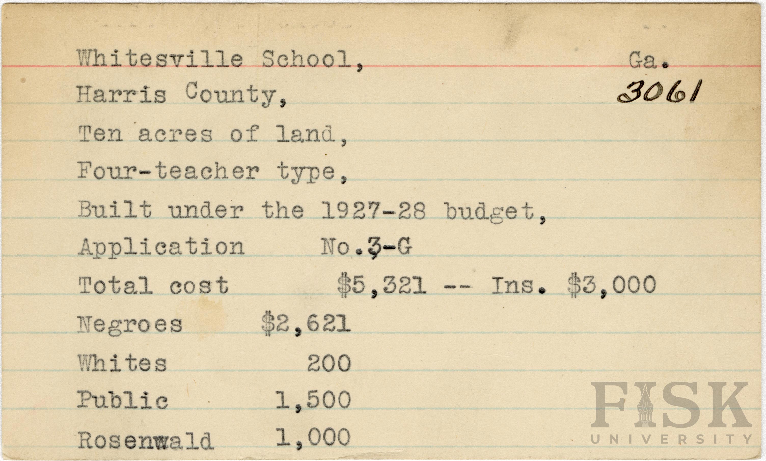 - School card from Rosenwald Fund for Whitesville School in Harris County, Georgia with a section added to the budget contributions that says, "Ins. $3,000"