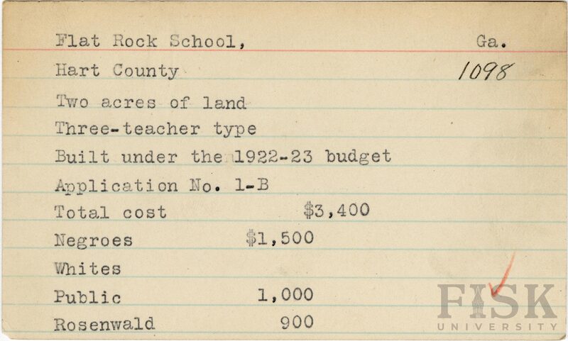 - School card from Rosenwald Fund for Flat Rock School in Hart County, Georgia