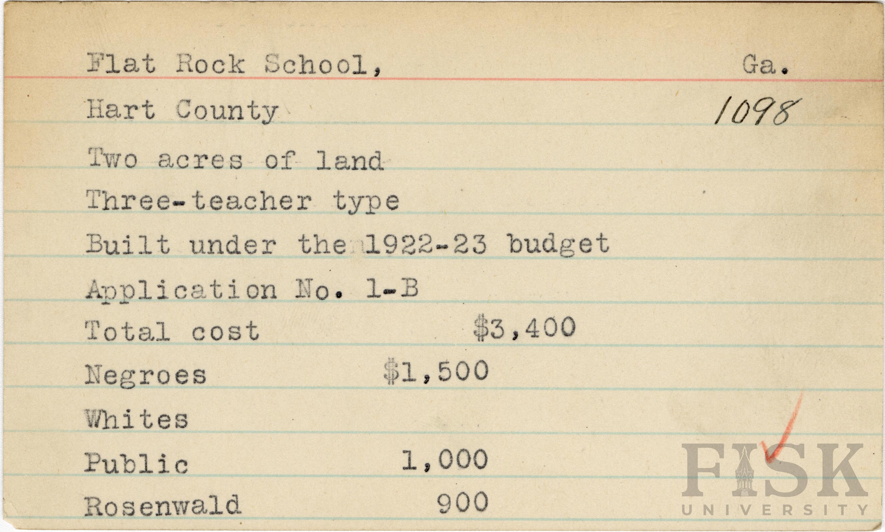 School card from Rosenwald Fund for Flat Rock School in Hart County, Georgia