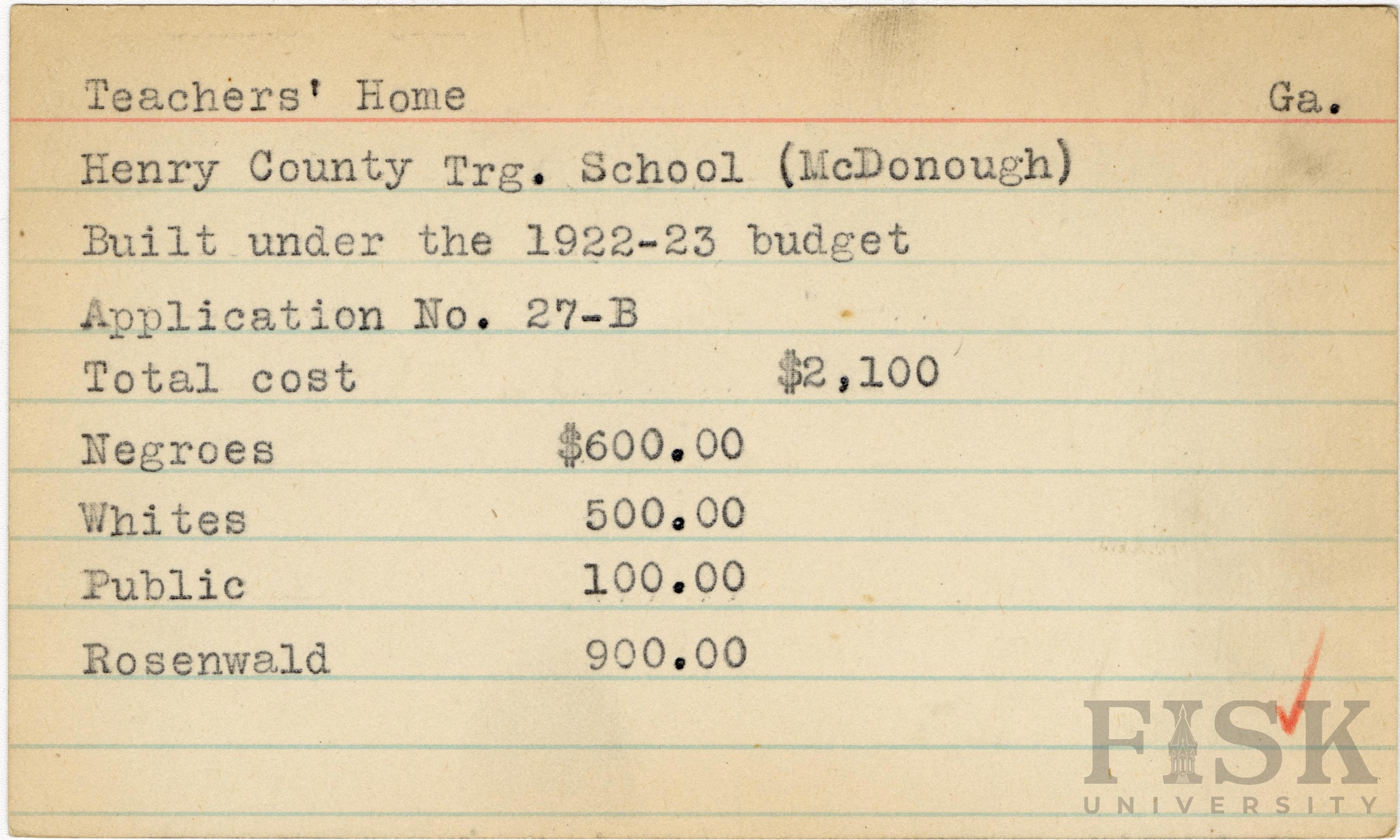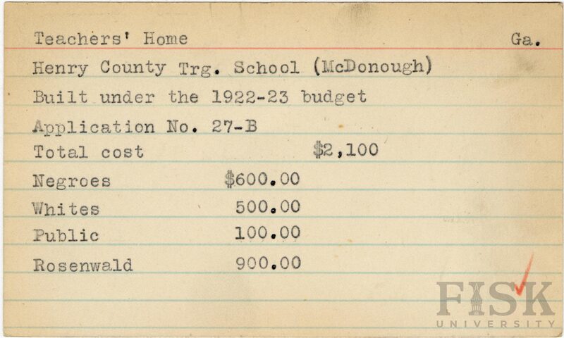 - School card from Rosenwald Fund for the teacher's home at County Training School in Henry County, Georgia