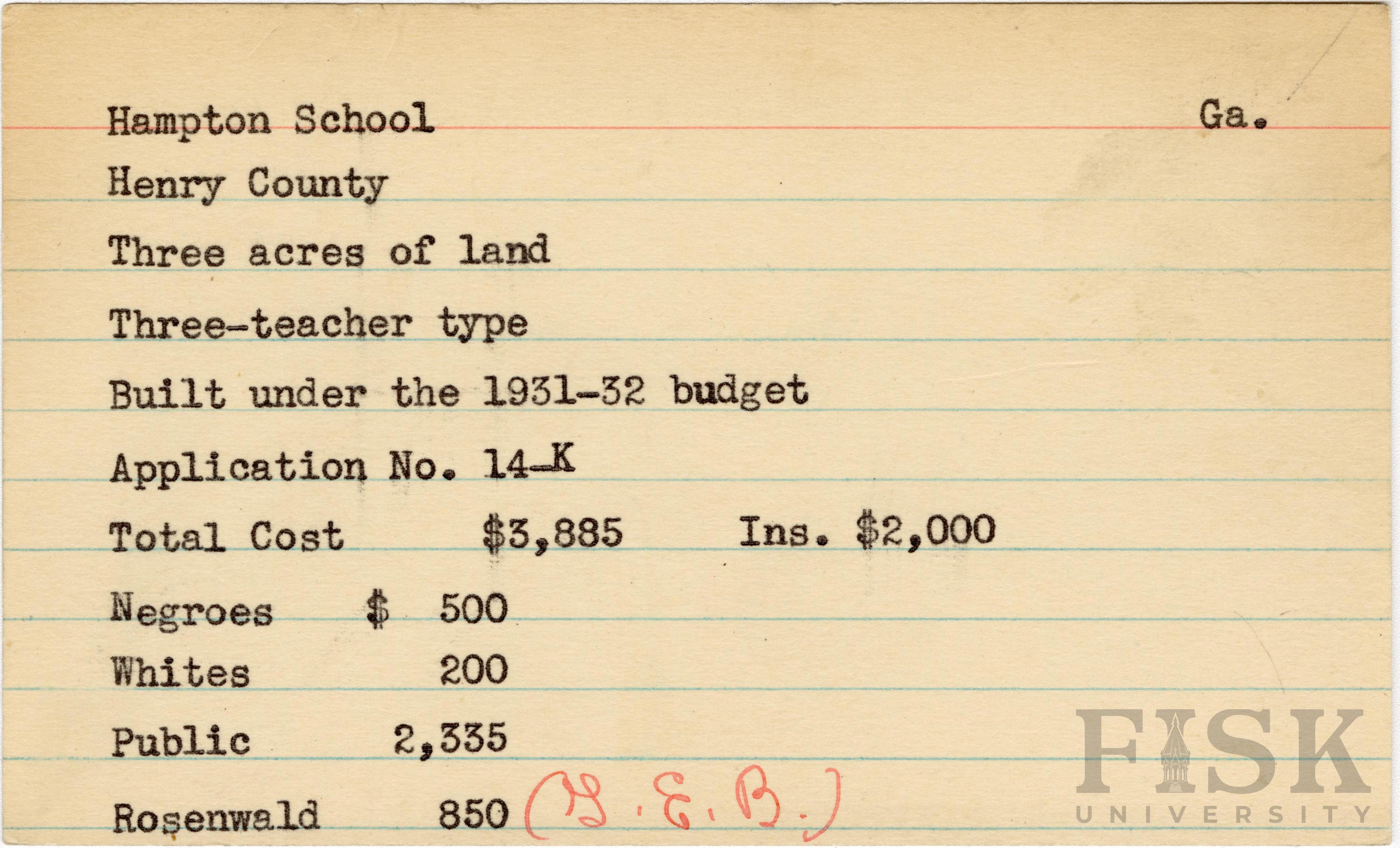 School card from Rosenwald Fund for Hampton School in Henry County, Georgia with a section added to the budget contributions that says, "Ins. $2,000" and a handwritten addition to the Rosenwald budget contribution that says, "(G.E.B.)"