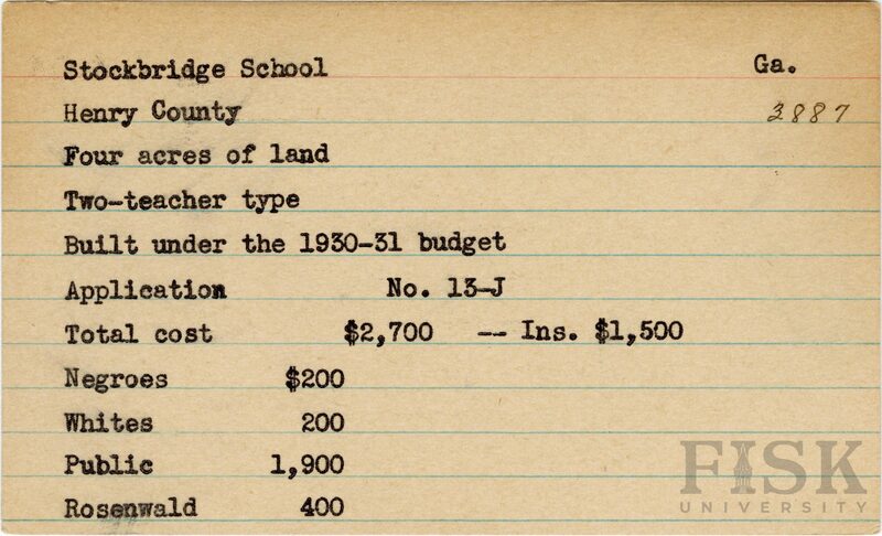 School card from Rosenwald Fund for Stockbridge School in Henry County, Georgia with a section added to the budget contributions that says, "Ins. $1,500"