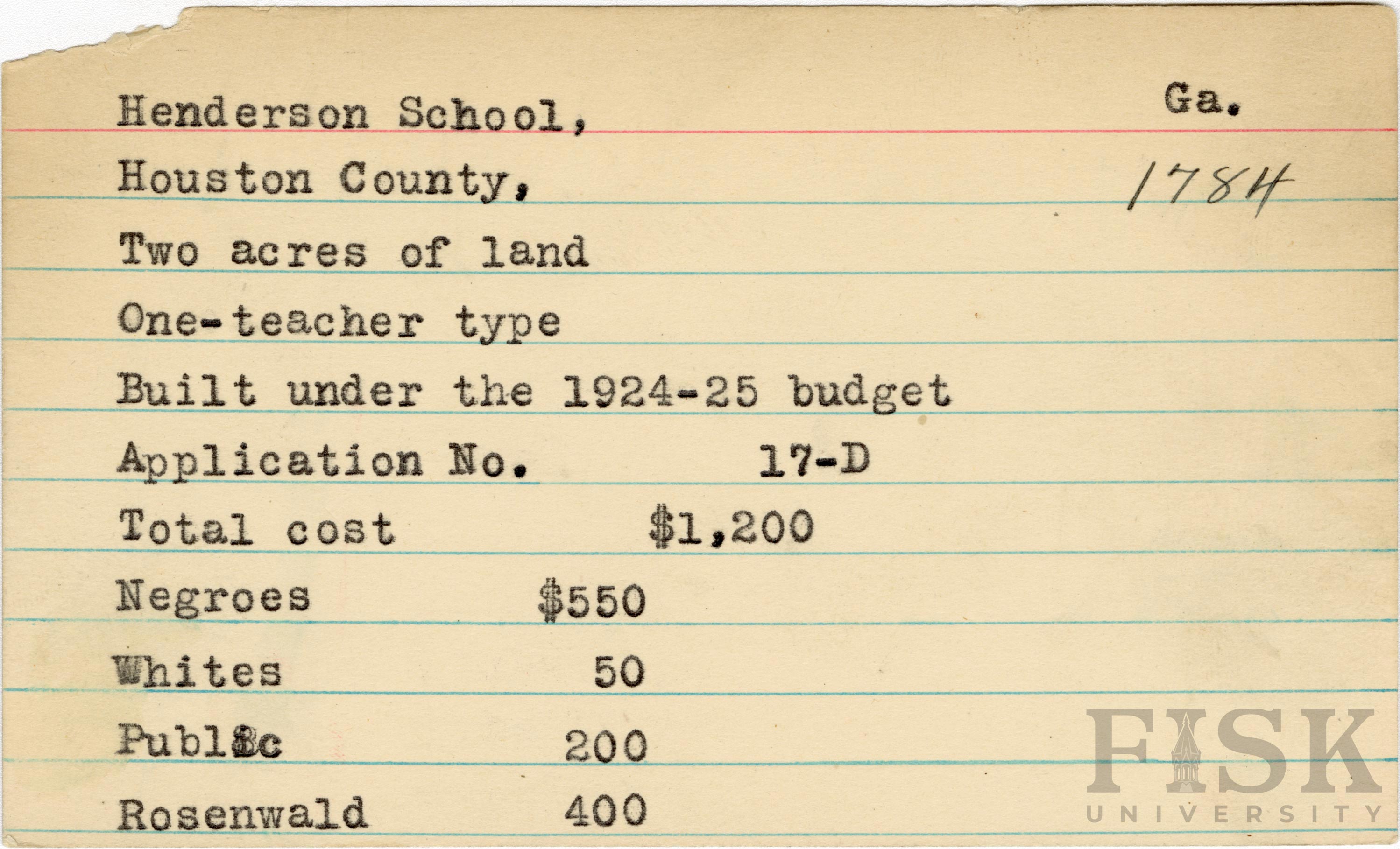 - School card from Rosenwald Fund for Henderson School in Houston County, Georgia