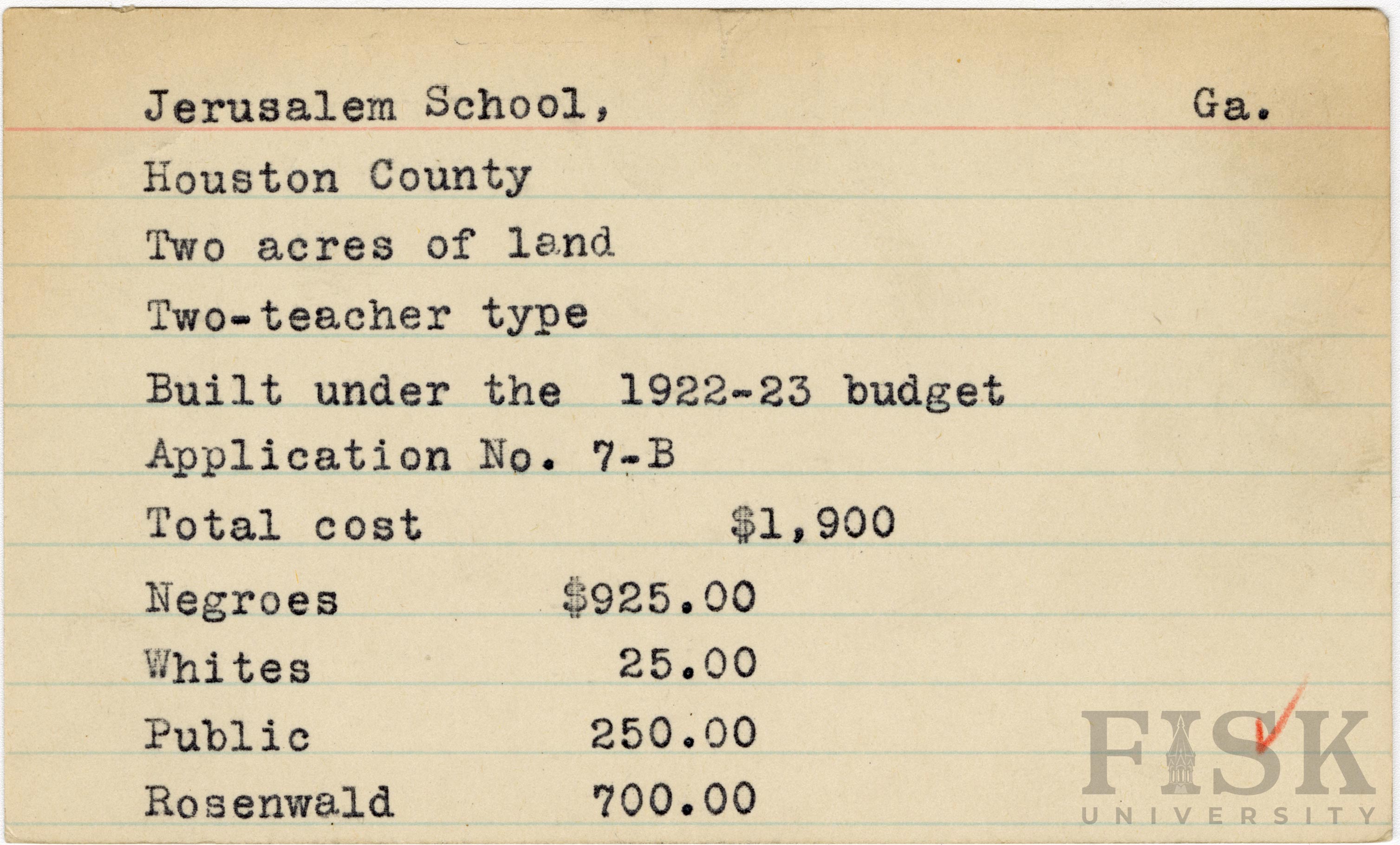 - School card from Rosenwald Fund for Jerusalem School in Houston County, Georgia