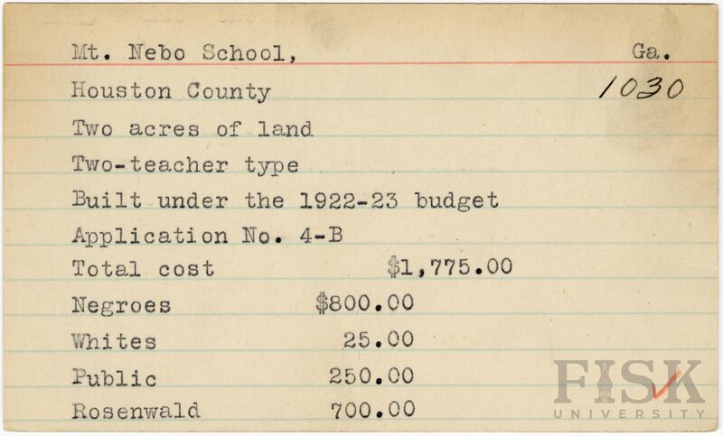 - School card from Rosenwald Fund for Mt. Nebo School in Houston County, Georgia