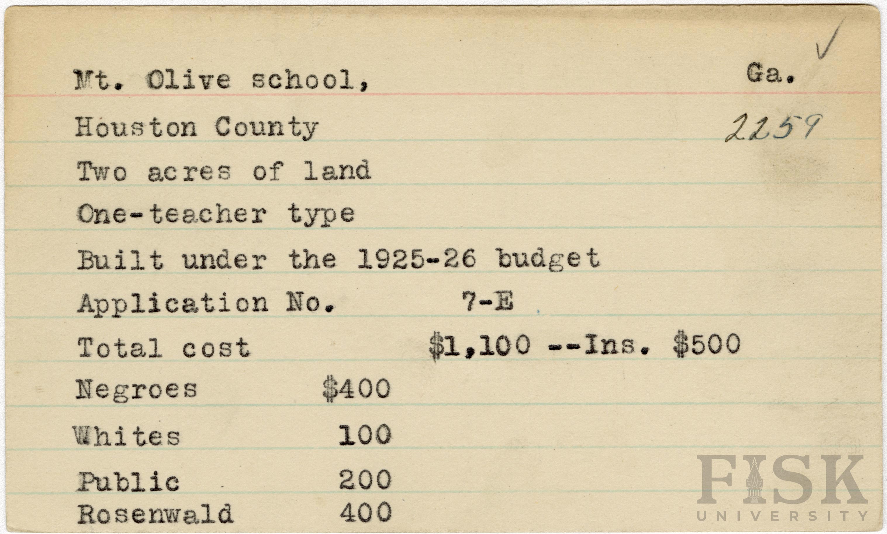 School card from Rosenwald Fund for Mt. Olive School in Houston County, Georgia with a section added to the budget contributions that says, "Ins. $500"