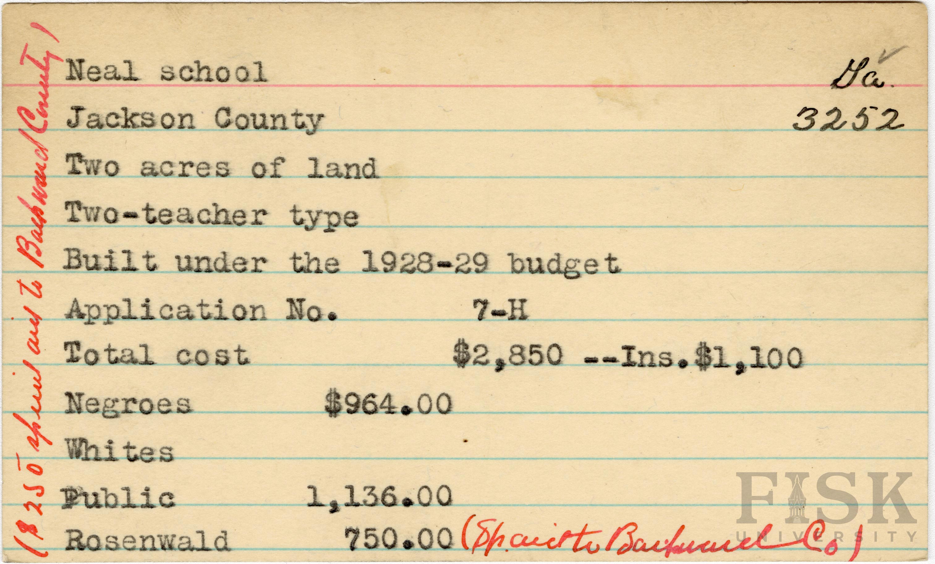 School card from Rosenwald Fund for Neal School in Jackson County, Georgia with handwritten notes that say, "(Sp. Aid to Backward Co)" and "($250 special aid to Backward County)"