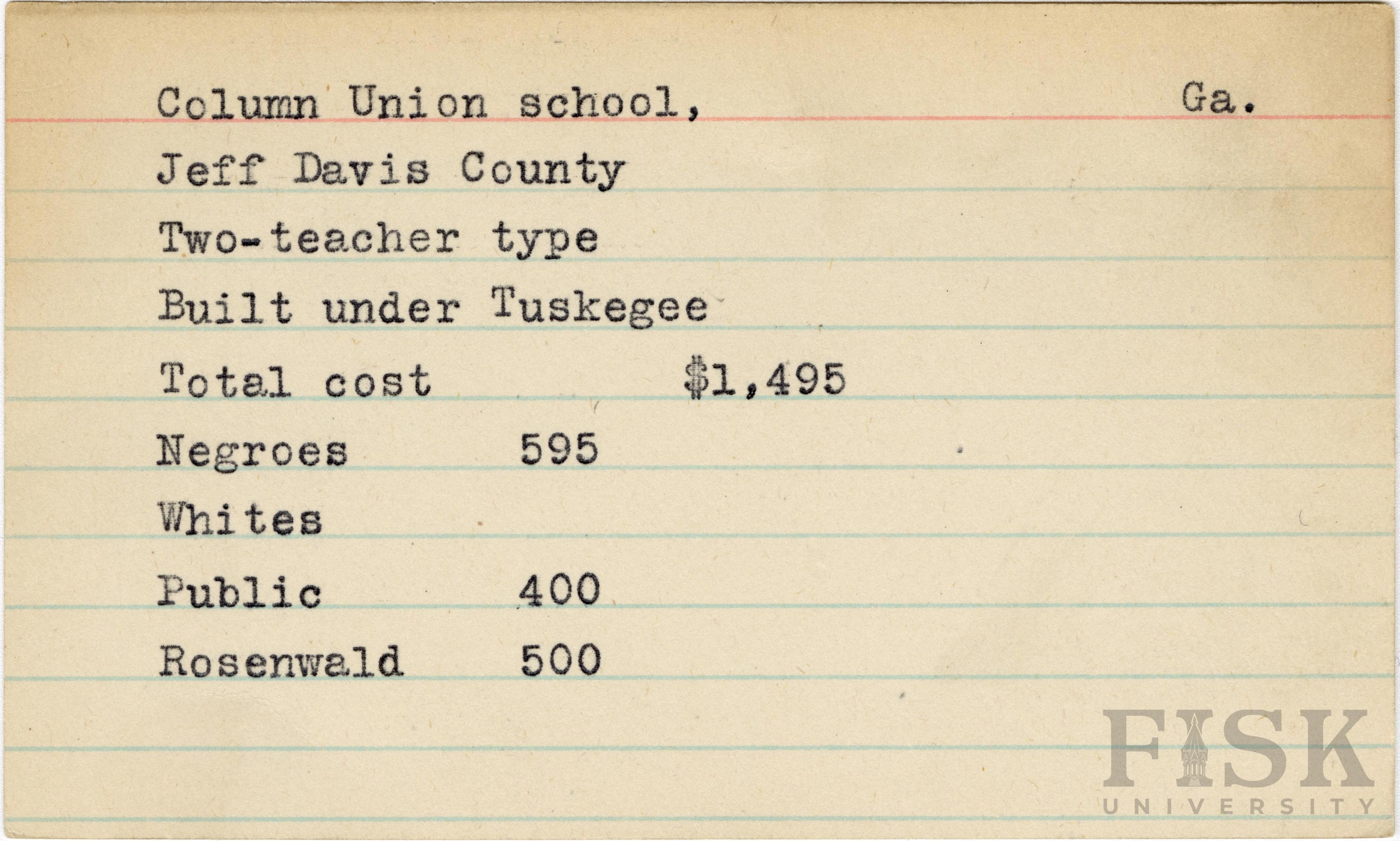 - School card from Rosenwald Fund for Column Union School in Jefferson Davis County, Georgia