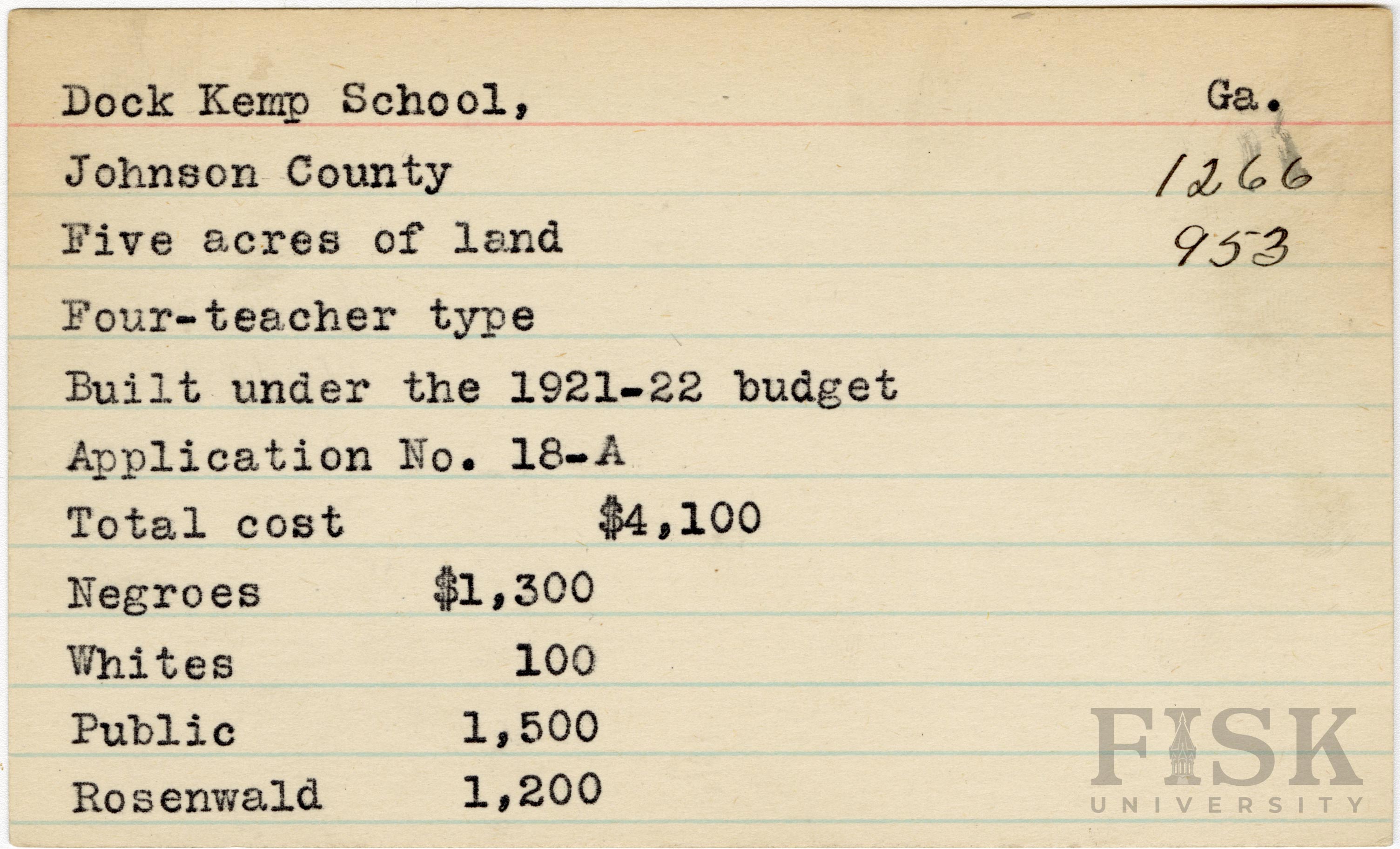 - School card from Rosenwald Fund for Dock Kemp School in Johnson County, Georgia