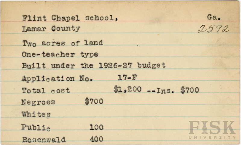 - Julius Rosenwald Fund--Buildings, African American schools--History--20th century, African American schools -- Flint Chapel School