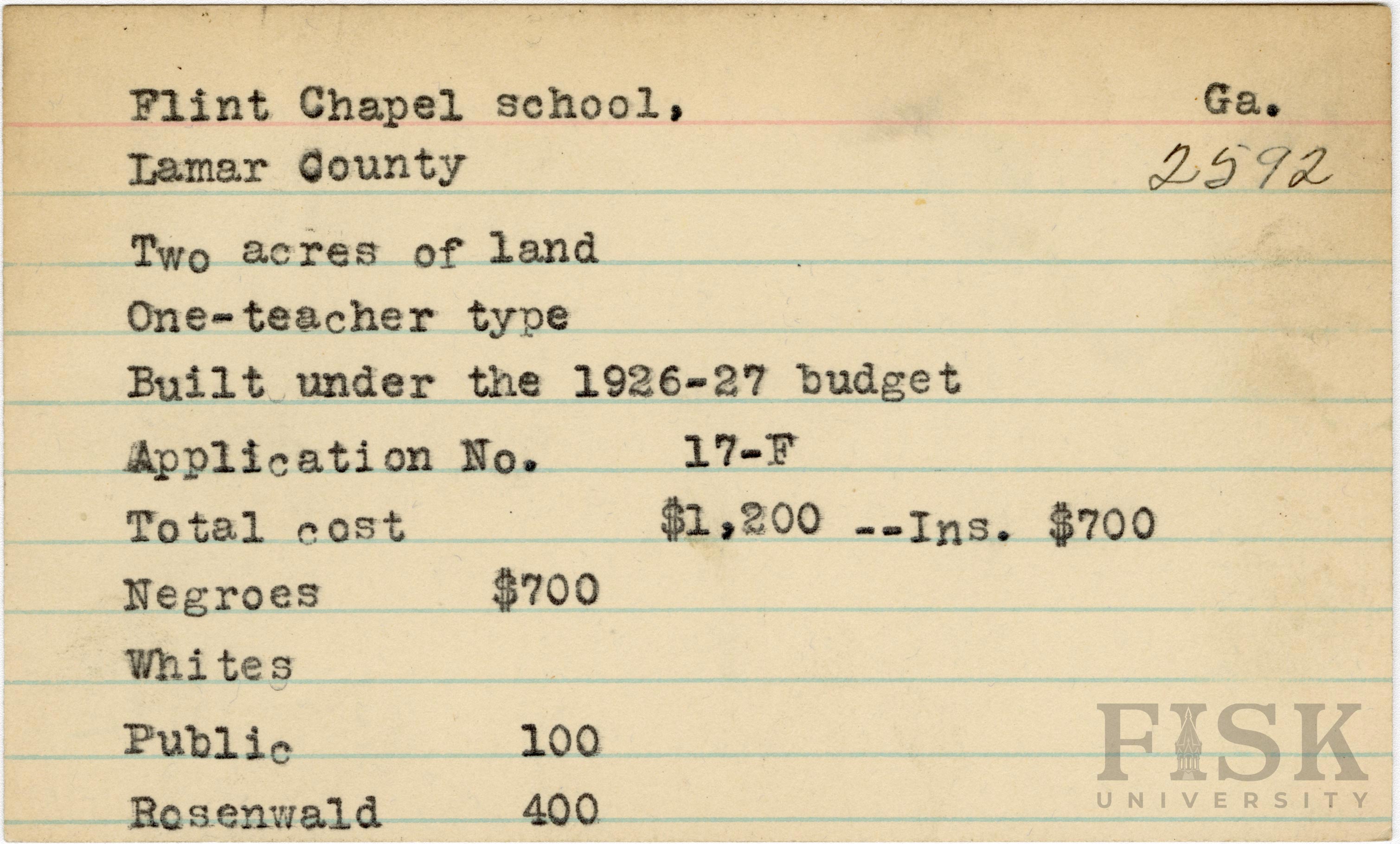 - School card from Rosenwald Fund for Flint Chapel School in Lamar County, Georgia with a section added to the budget contributions that says, "Ins. $700"
