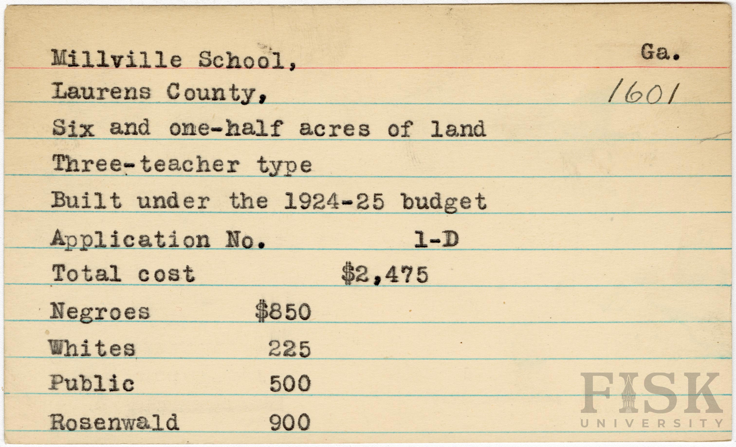 - School card from Rosenwald Fund for Millville School in Laurens County, Georgia