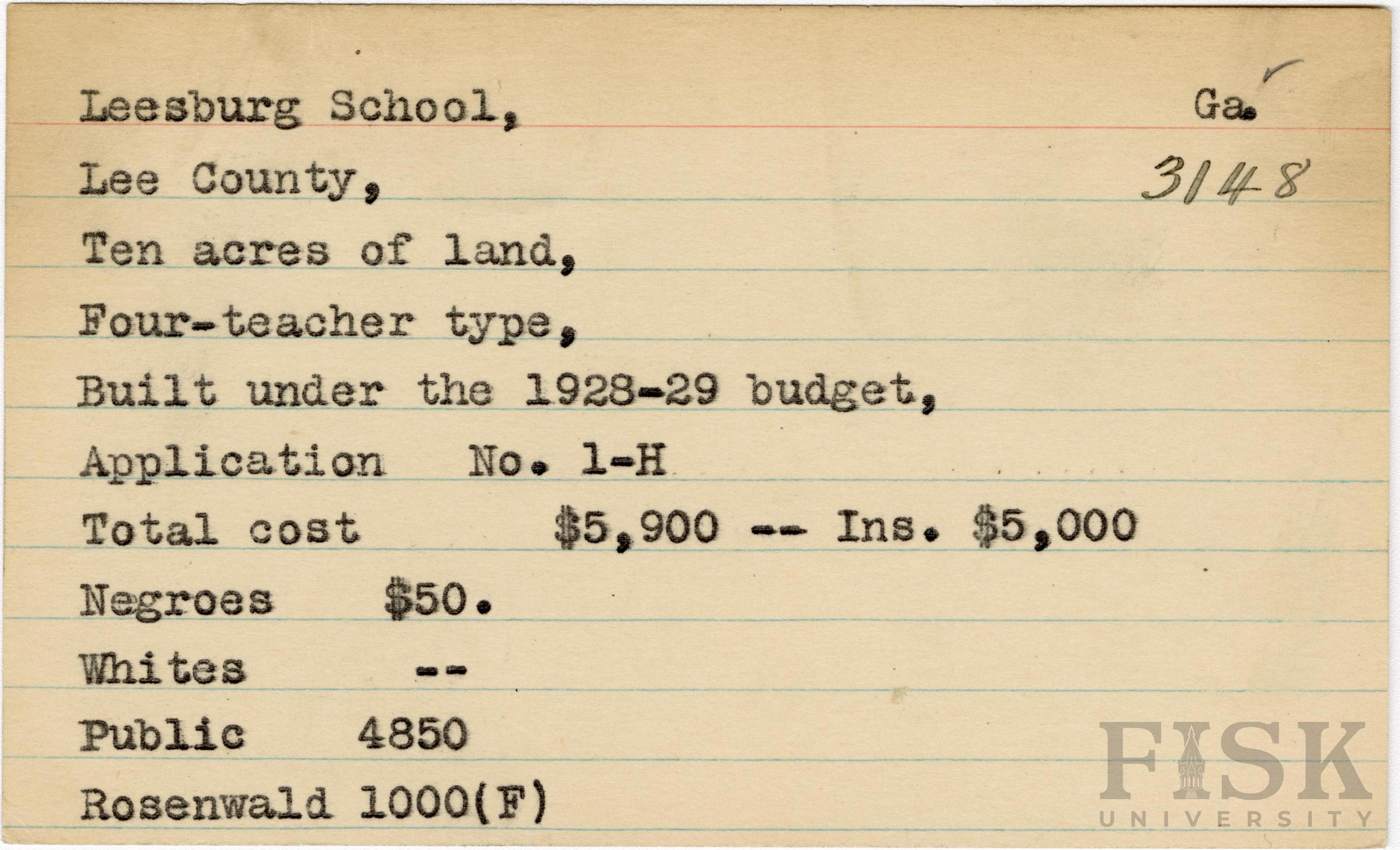 School card from Rosenwald Fund for Leesburg School in Lee County, Georgia with a section added to the budget contributions that says, "Ins. $5,000"