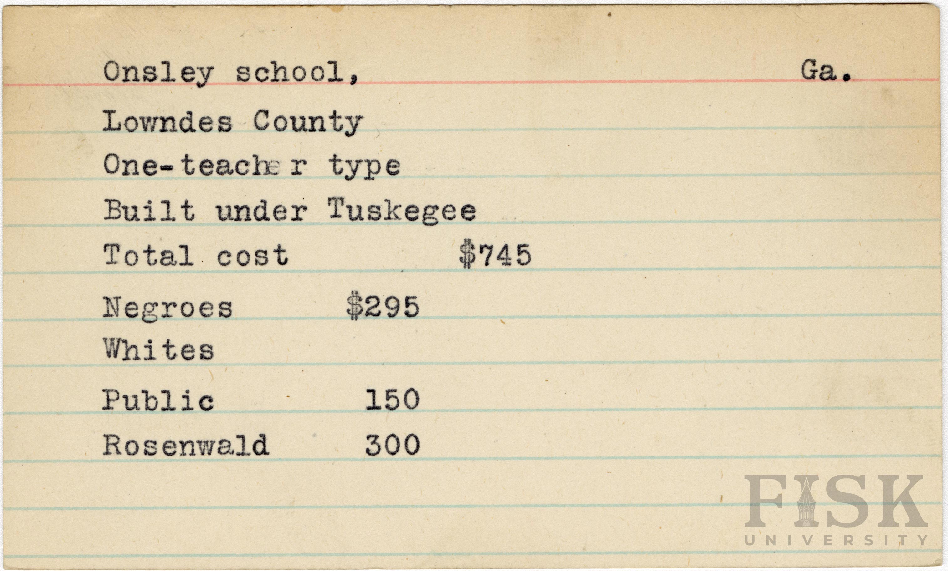 - School card from Rosenwald Fund for Onsley School in Lowndes County, Georgia