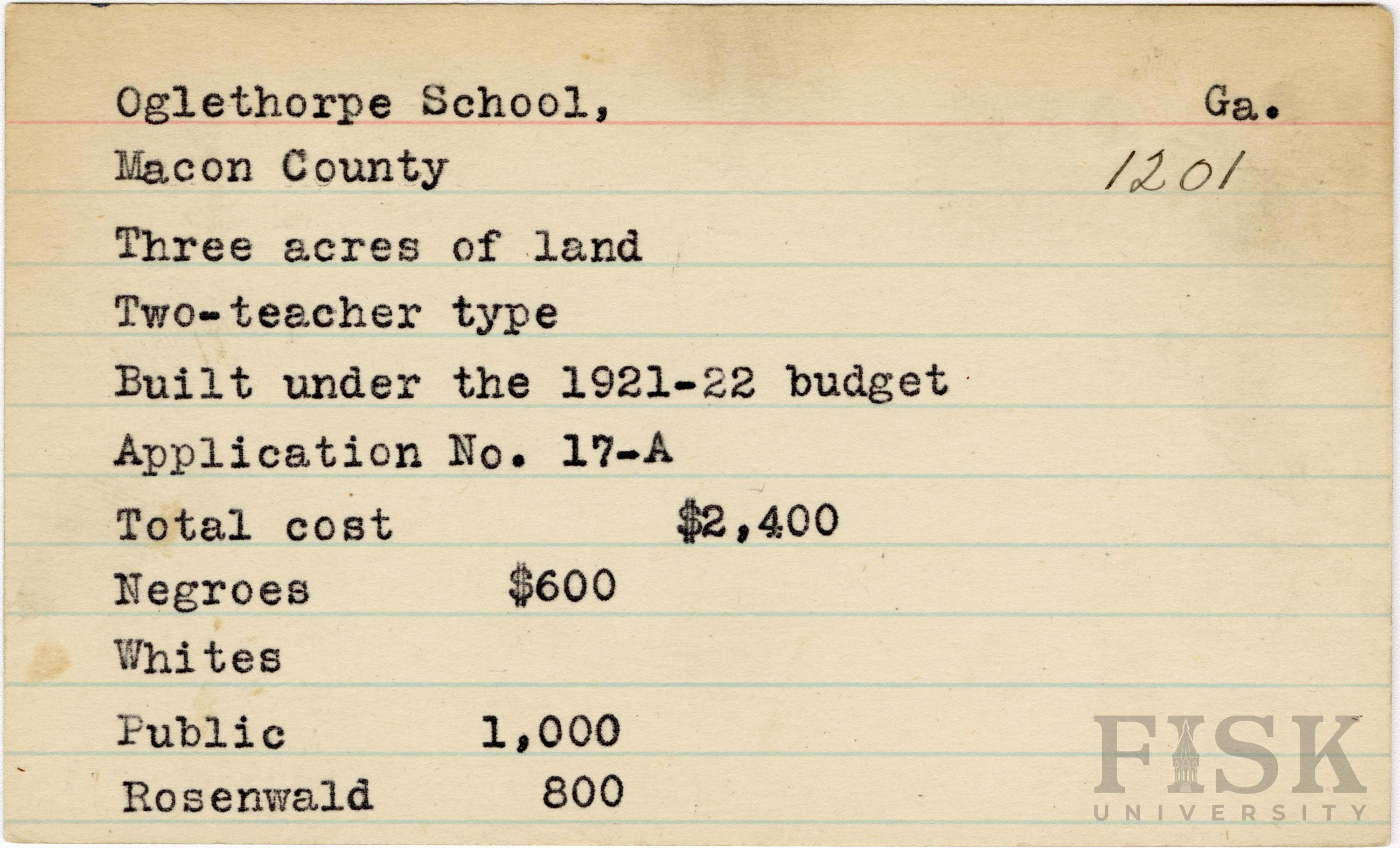 - School card from Rosenwald Fund for Oglethorpe School in Macon County, Georgia