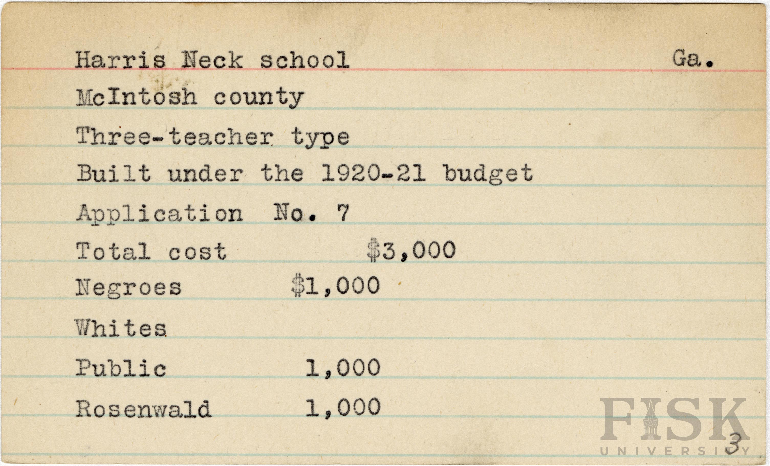 - School card from Rosenwald Fund for Harris Neck School in McIntosh County, Georgia