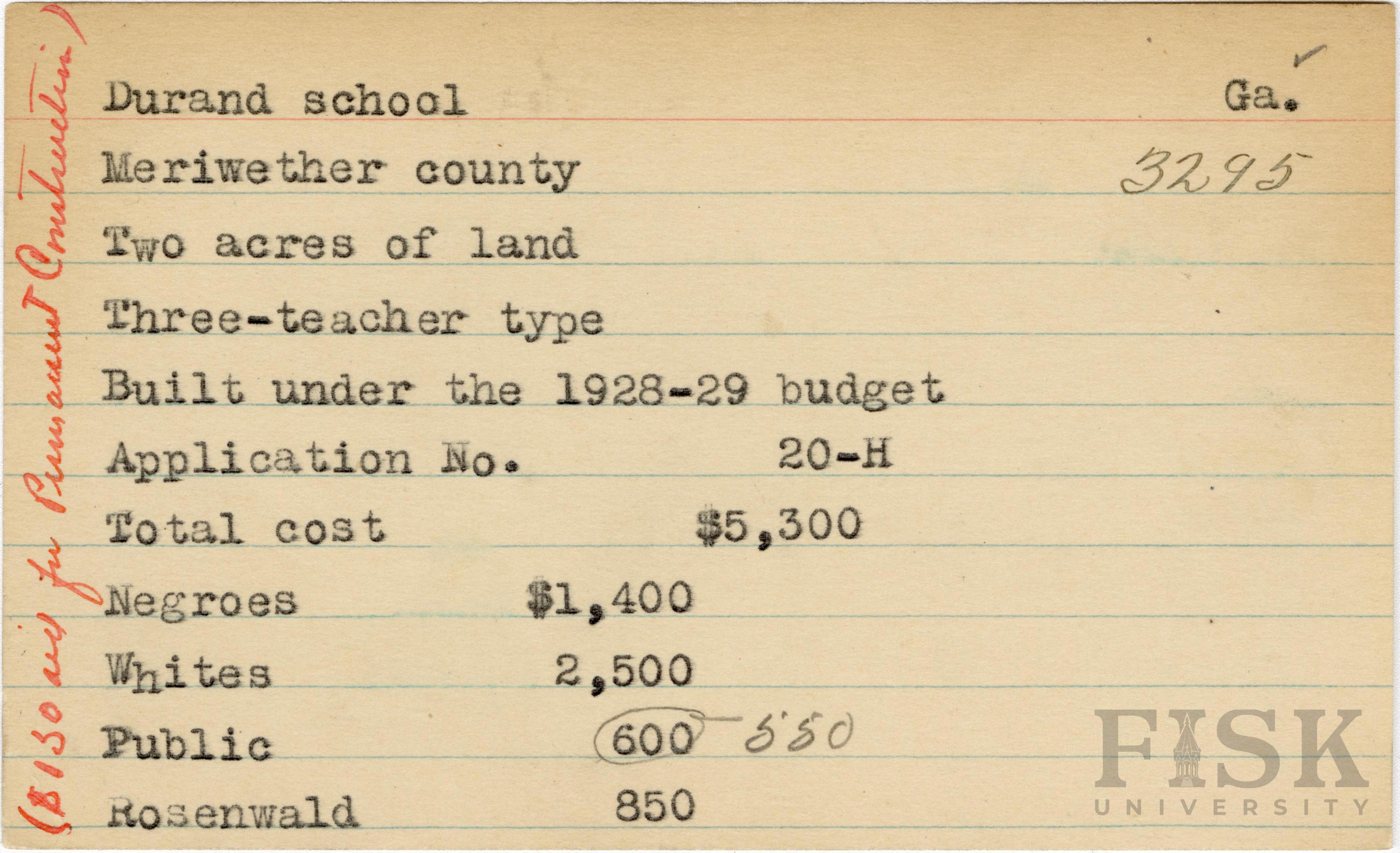 - School card from Rosenwald Fund for Durand School in Meriwether County, Georgia with a handwritten note on the far left of the card that says, "($150 aid for permanent construction)"