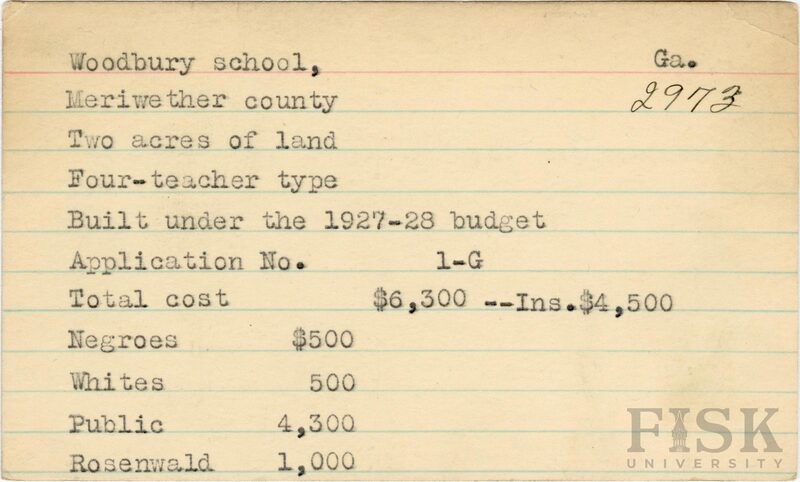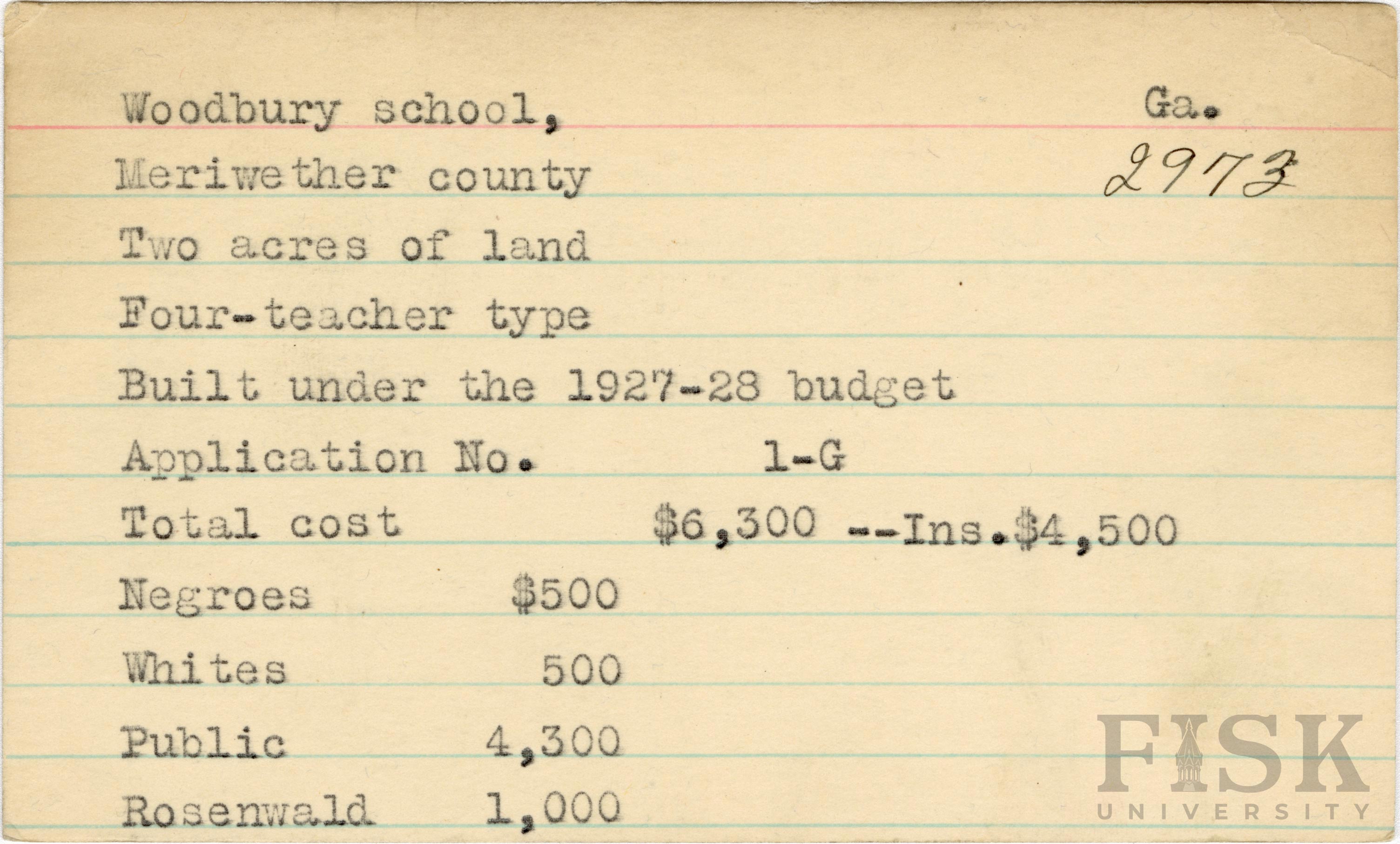 School card from Rosenwald Fund for Woodbury School in Meriwether County, Georgia with a section added to the budget contributions that says, "Ins. $4,500"