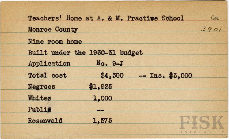 - School card from Rosenwald Fund for the nine-room teacher's home at A & M Practice School in Monroe County, Georgia with a section added to the budget contributions that says, "Ins. $3,000"