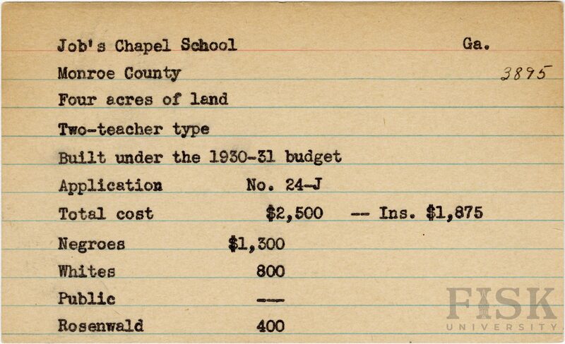 - School card from Rosenwald Fund for Job's Chapel School in Monroe County, Georgia
