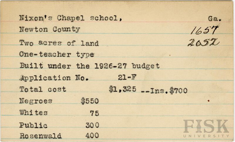 - School card from Rosenwald Fund for Nixon's Chapel School in Newton County, Georgia with a section added to the budget contributions that says, "Ins. $700"