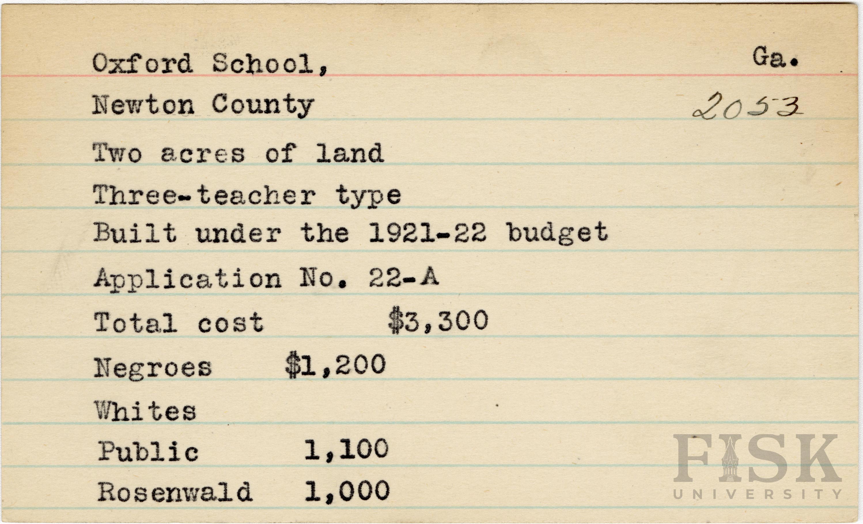 School card from Rosenwald Fund for Oxford School in Newton County, Georgia