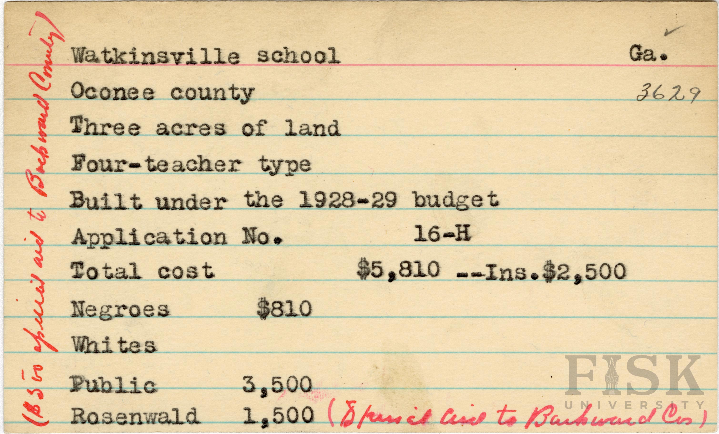 School card from Rosenwald Fund for Watkinsville School in Oconee County, Georgia with a section added to the budget contributions that says, "Ins. $2,500" and handwritten notes that say, "($500 special aid to Backward County)" and "(Special aid to Backward Co)"