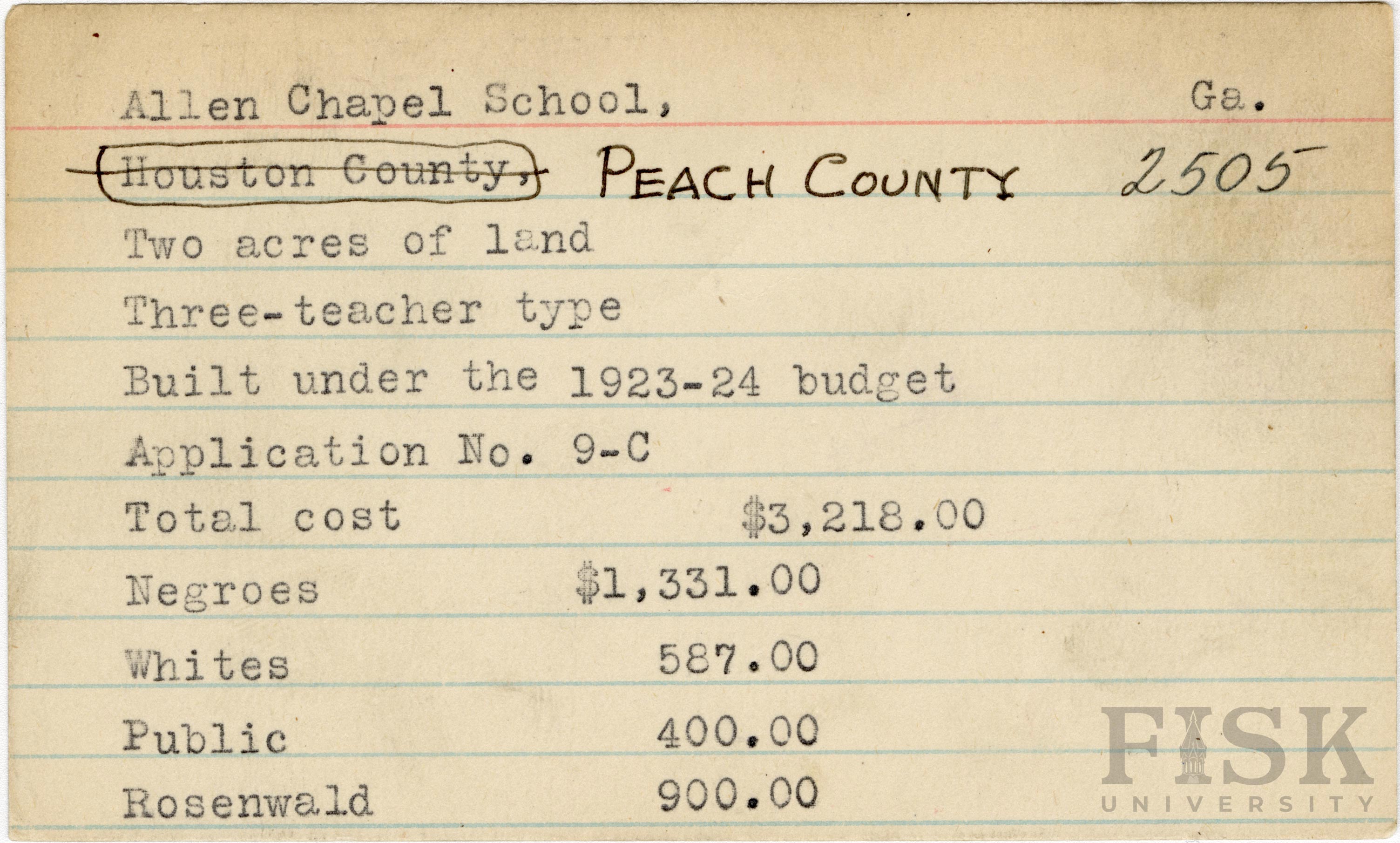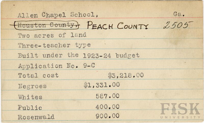 - School card from Rosenwald Fund for Allen Chapel School in Peach County, Georgia