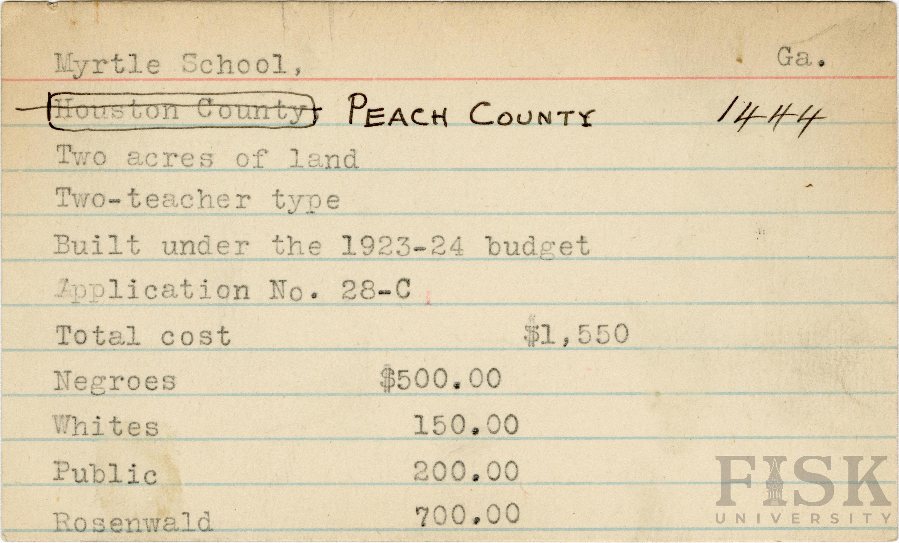 - School card from Rosenwald Fund for Myrtle School in Peach County, Georgia. County is listed on photo card as Houston County.