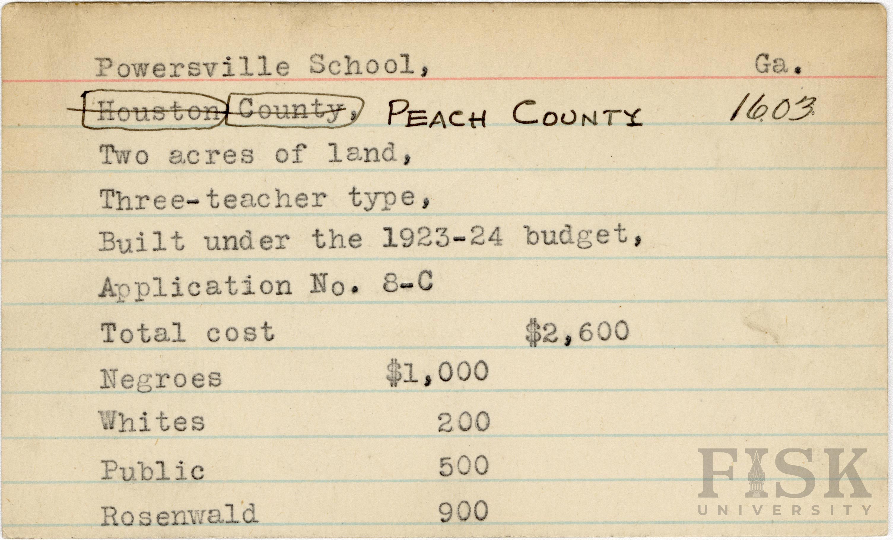 - School card from Rosenwald Fund for Powersville School in Peach County, Georgia. County is listed on photo card as Houston County