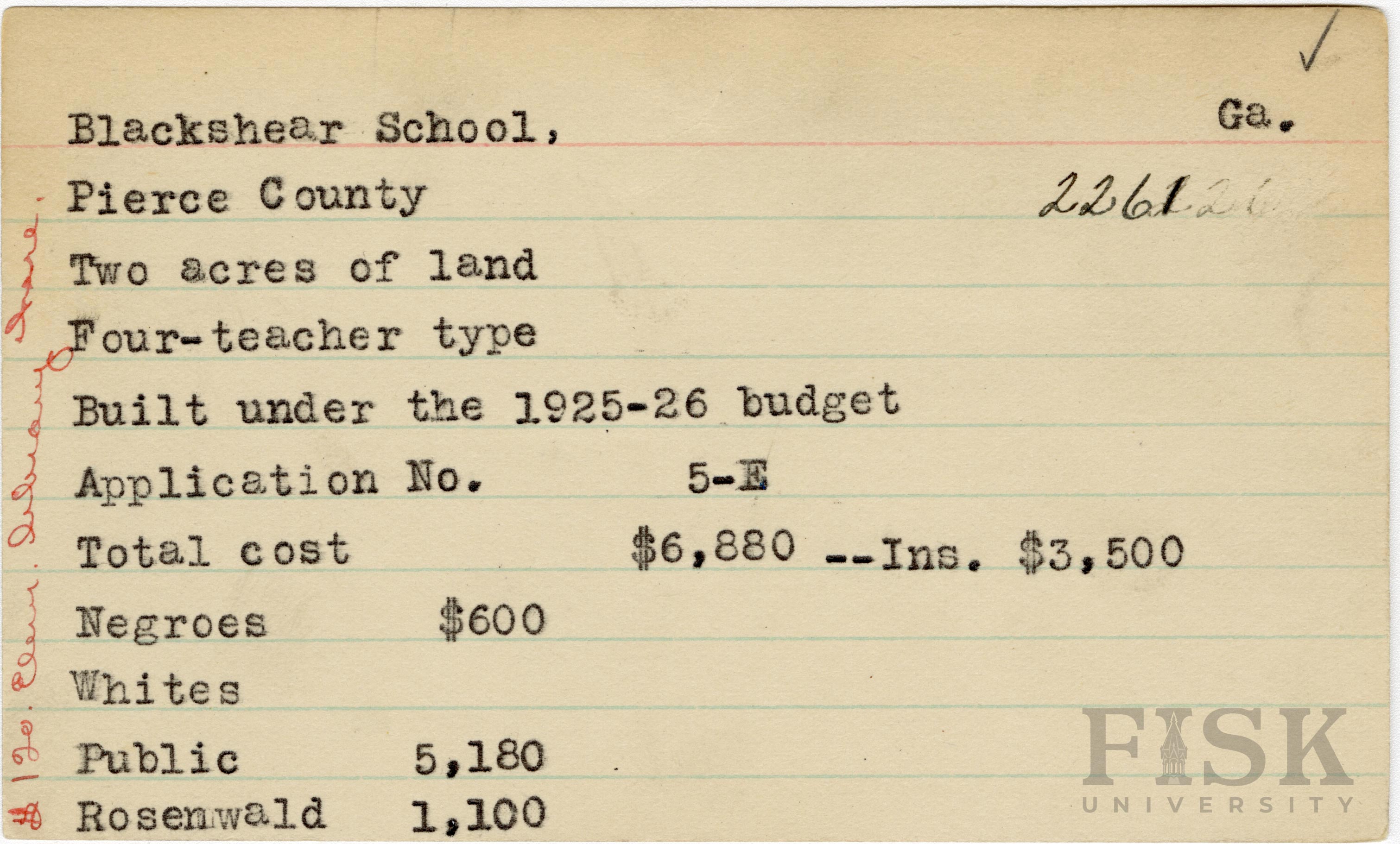 - School card from Rosenwald Fund for Blackshear School in Pierce County, Georgia with a section added to the budget contributions that says, "Ins. $3,500" and a handwritten note on the far left of the card that says, "$120 elem library here"