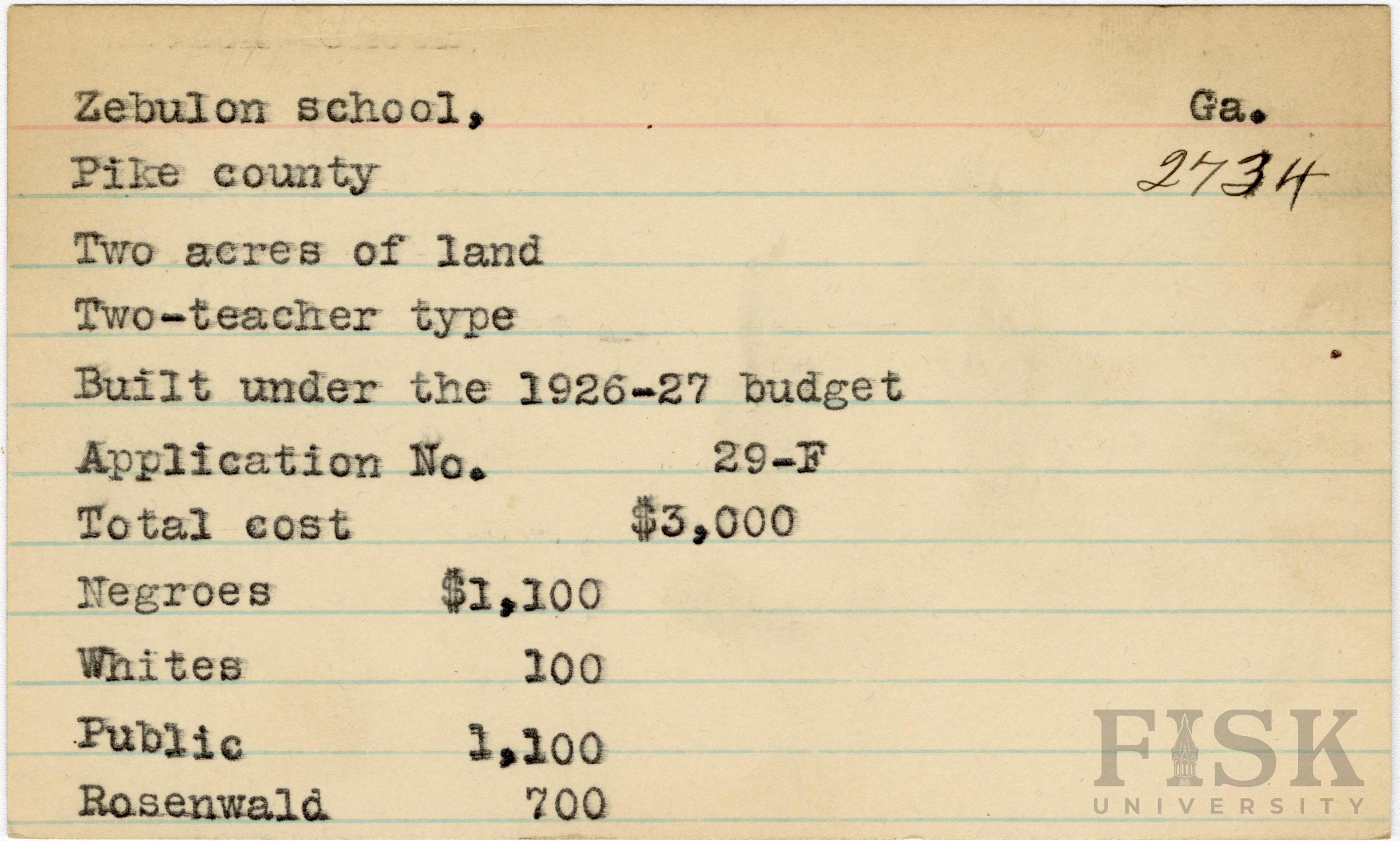 - School card from Rosenwald Fund for Zebulon School in Pike County, Georgia