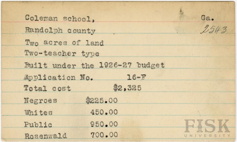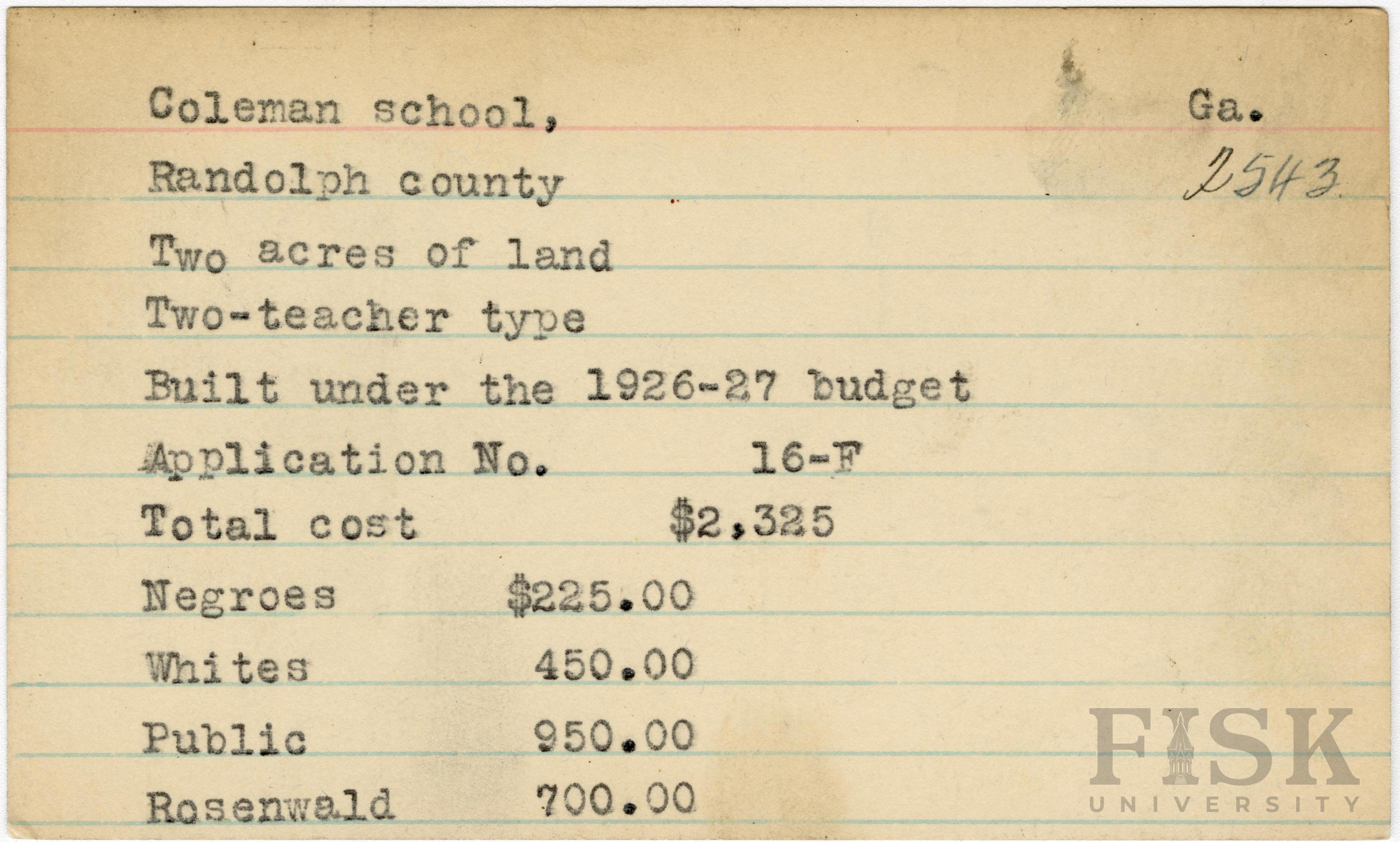 - School card from Rosenwald Fund for Coleman School in Randolph County, Georgia