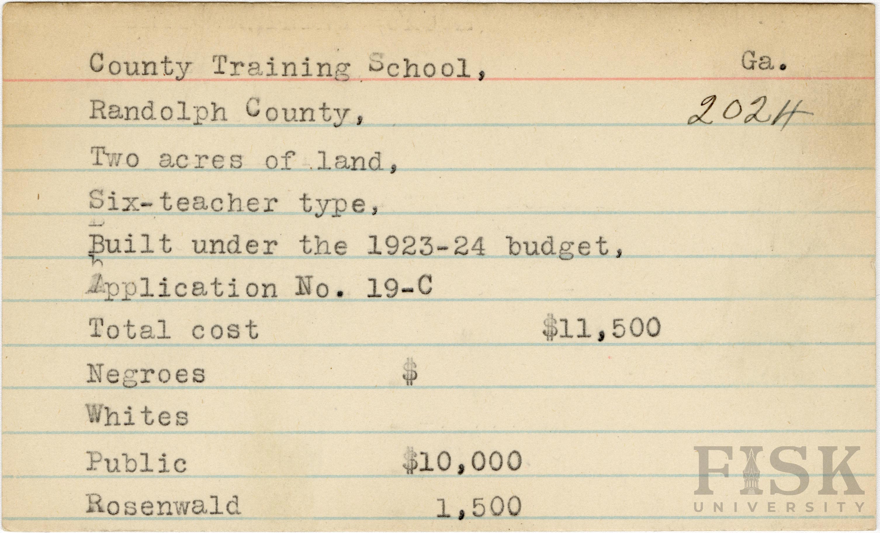 - School card from Rosenwald Fund for County Training School in Randolph County, Georgia
