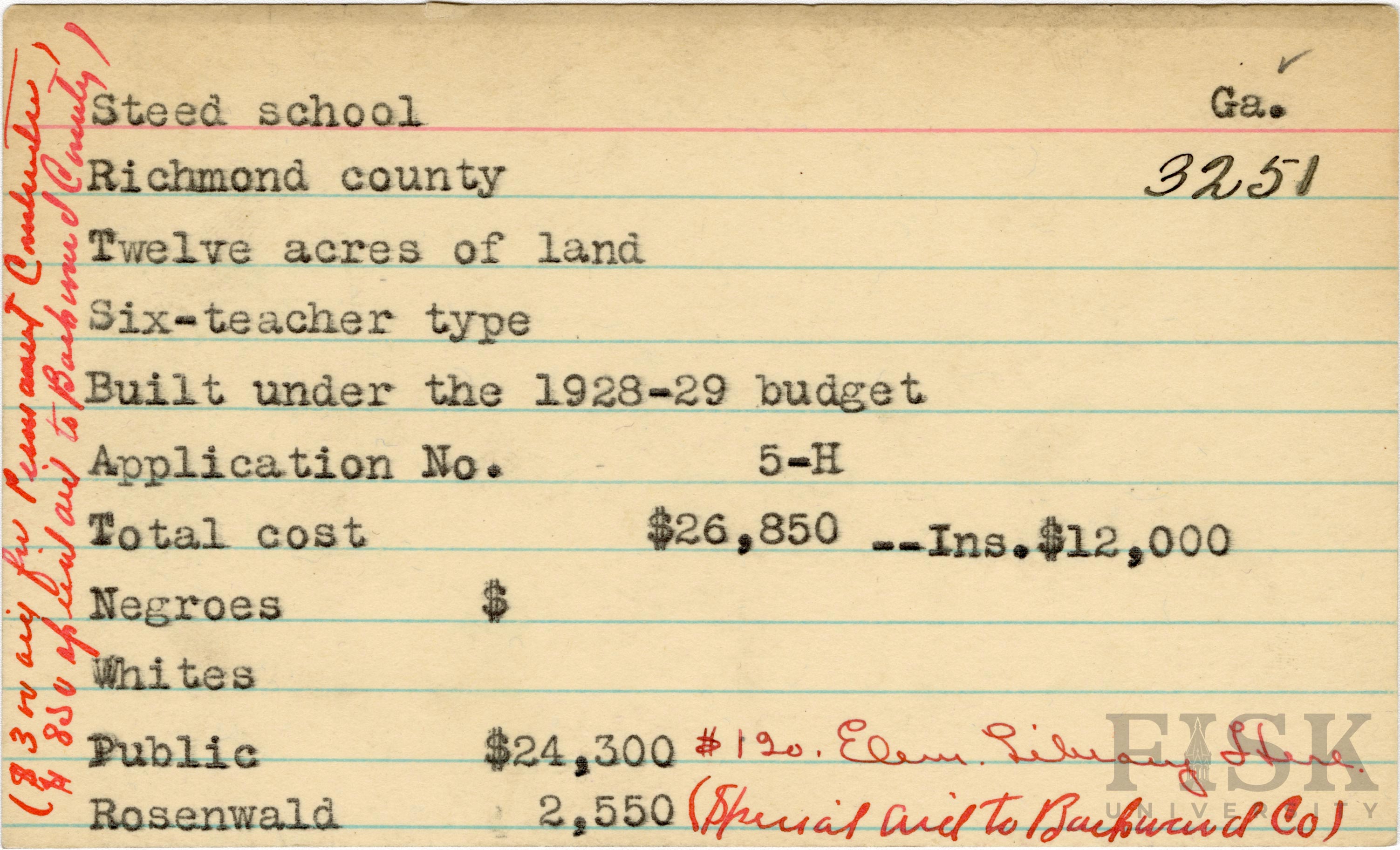 - School card from Rosenwald Fund for Steed School in Richmond County, Georgia with handwritten notes that say, "$120 elem library here" and "(Special aid to Backward Co)" and "($300 aid for permanent construction)" and "($850 special aid to Backward County)"