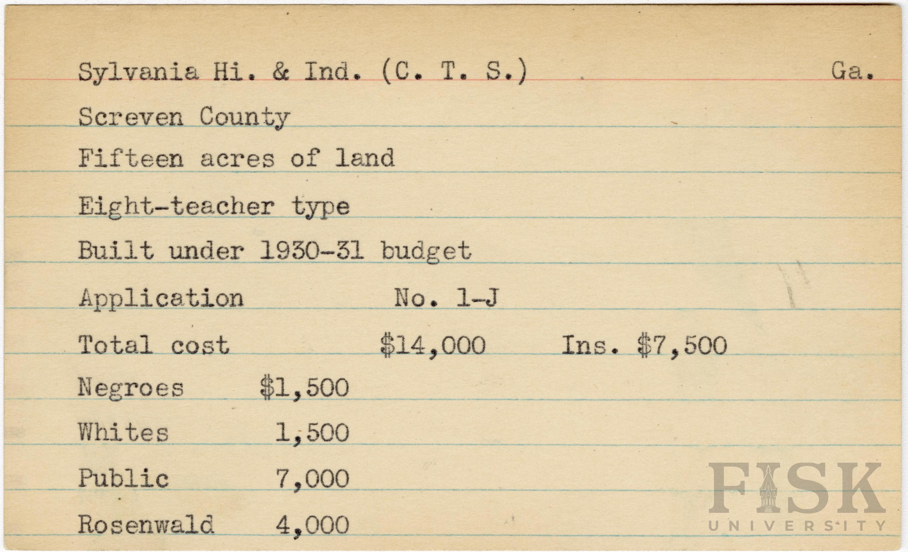 - School card from Rosenwald Fund for Sylvania Hi. & Ind. School in Screven County, Georgia with a section added to the budget contributions that says, "Ins. $7,500"