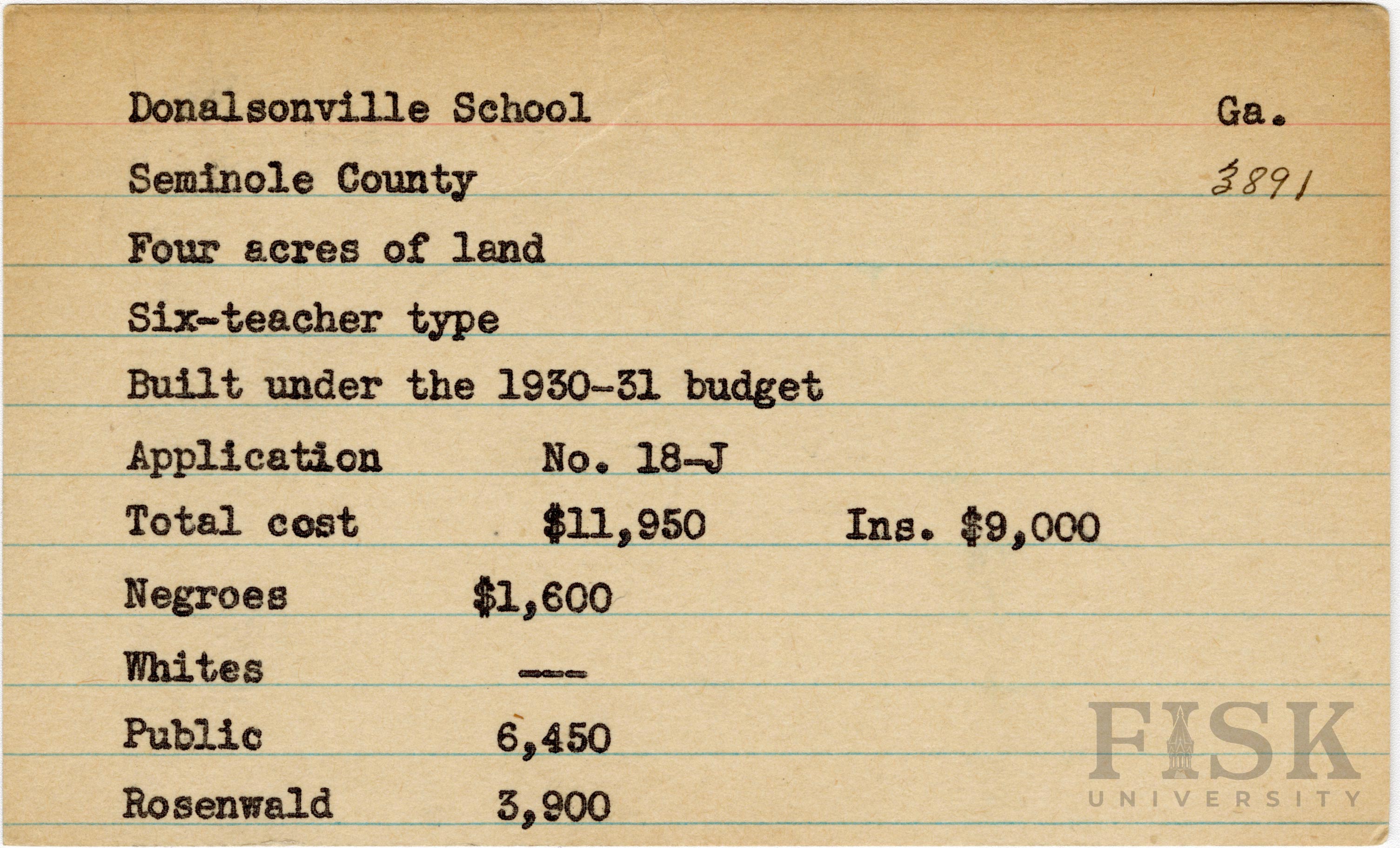 School card from Rosenwald Fund for Donalsonville School in Seminole County, Georgia with a section added to the budget contributions that says, "Ins. $9,000"