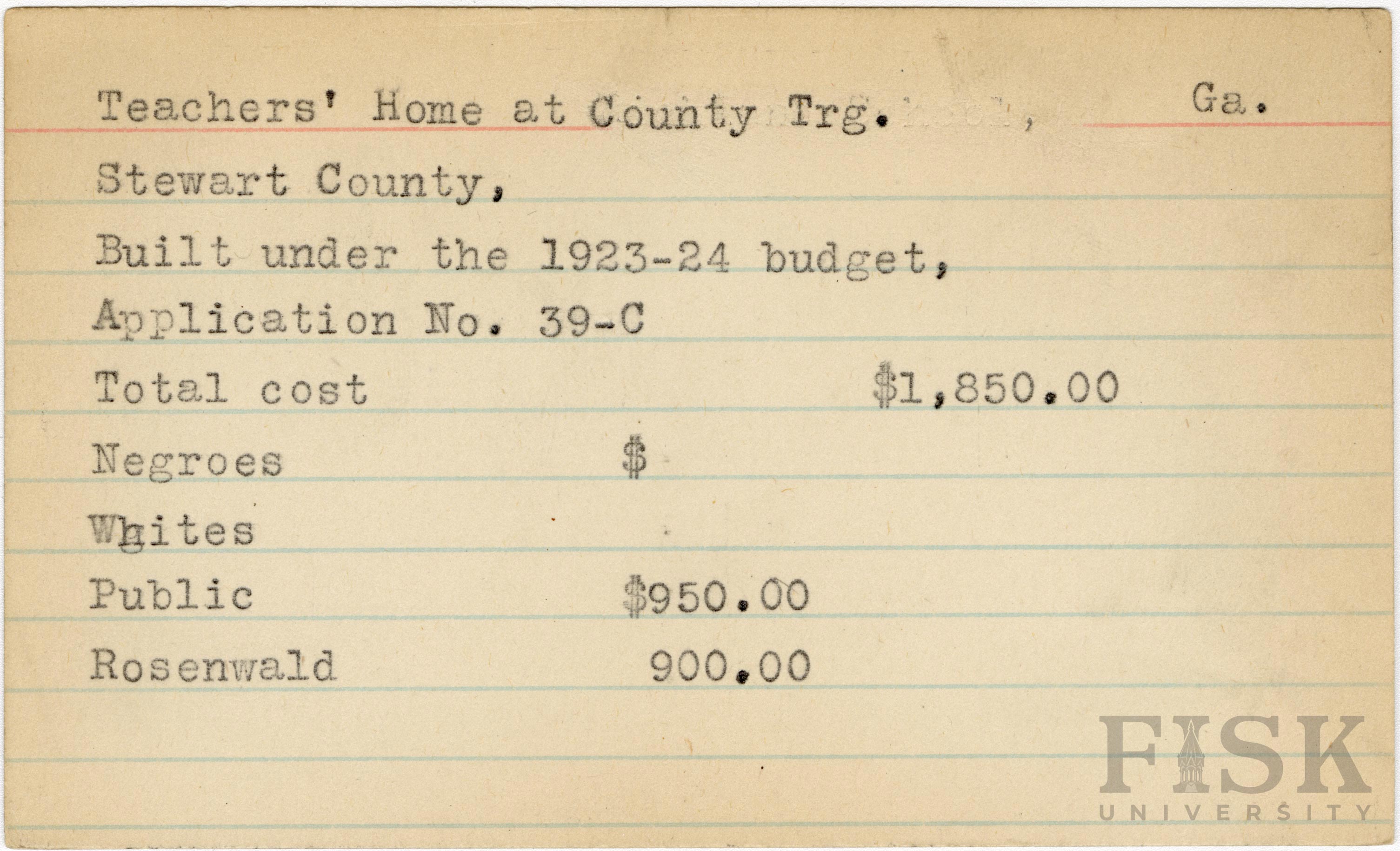 - School card from Rosenwald Fund for the teacher's home at County Training School in Stewart County, Georgia