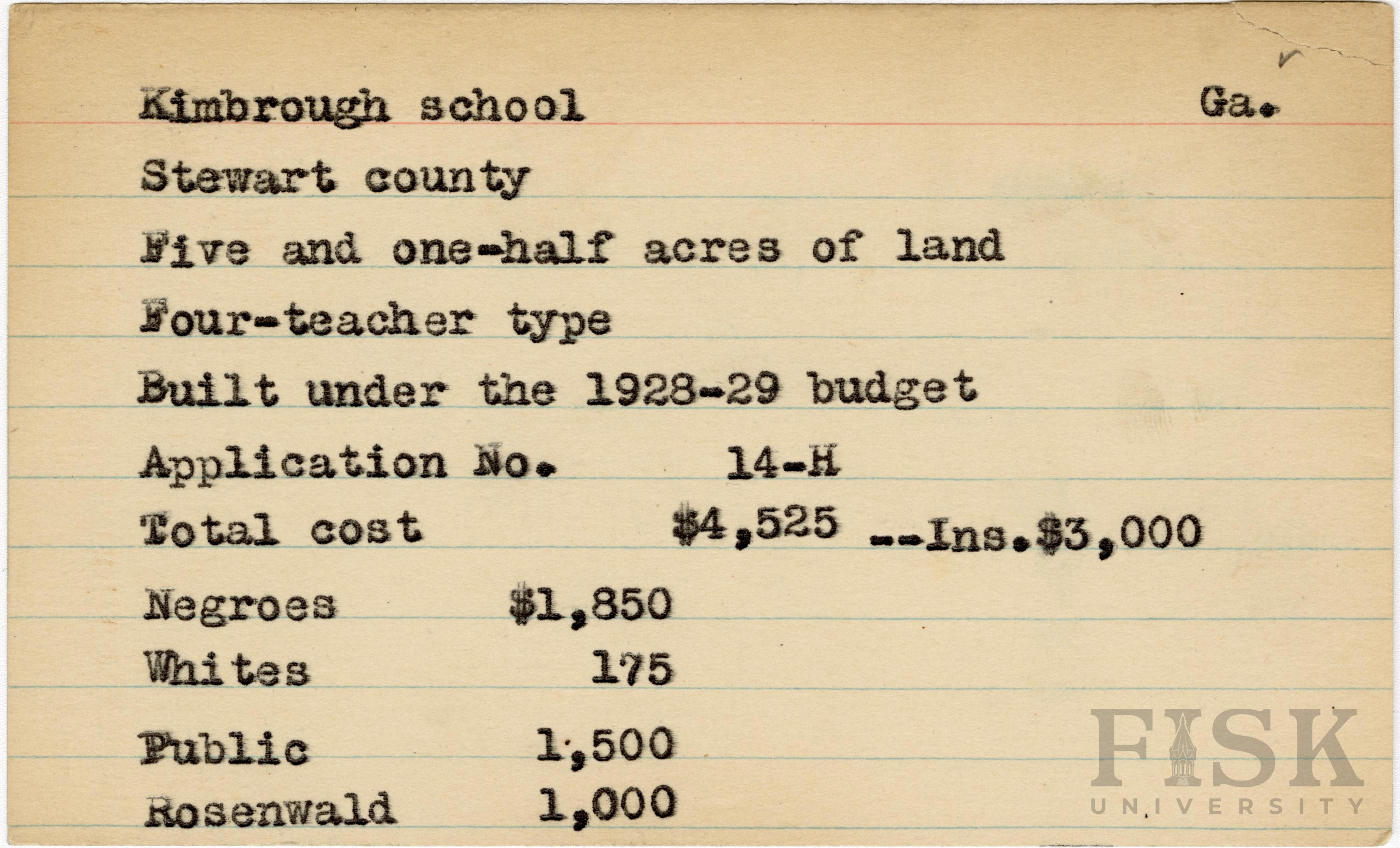 School card from Rosenwald Fund for Kimbrough School in Stewart County, Georgia with a section added to the budget contributions that says, "Ins. $3,000"