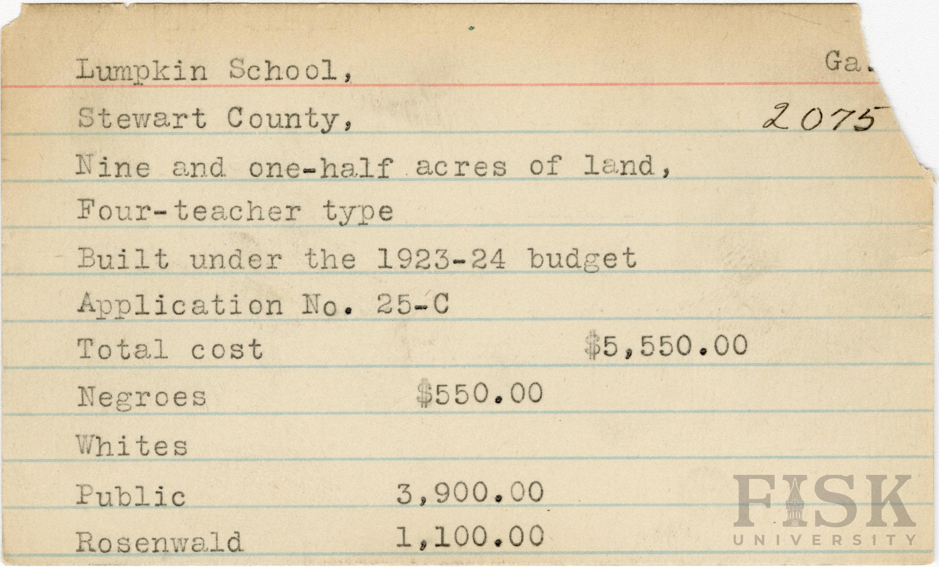 - School card from Rosenwald Fund for Lumpkin School in Stewart County, Georgia