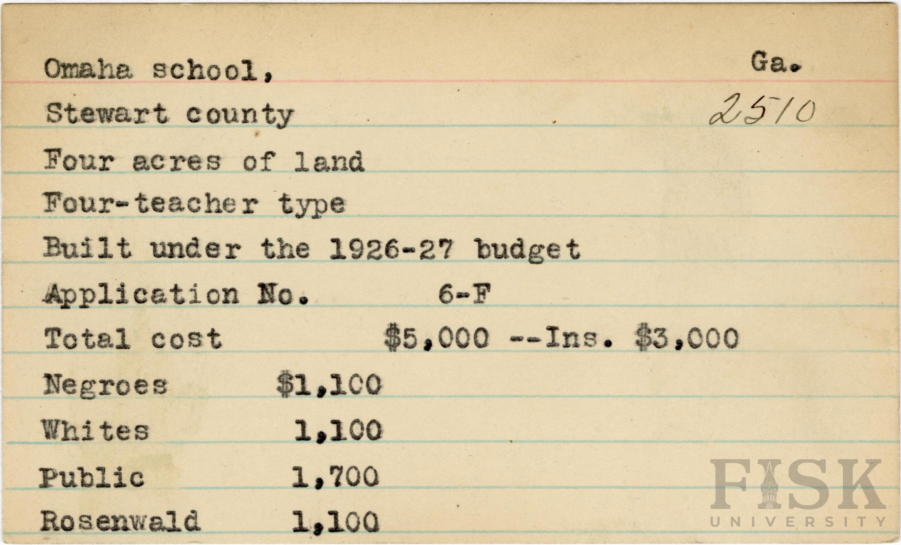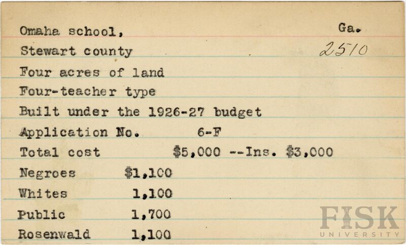 School card from Rosenwald Fund for Omaha School in Stewart County, Georgia with a section added to the budget contributions that says, "Ins. $3,000"