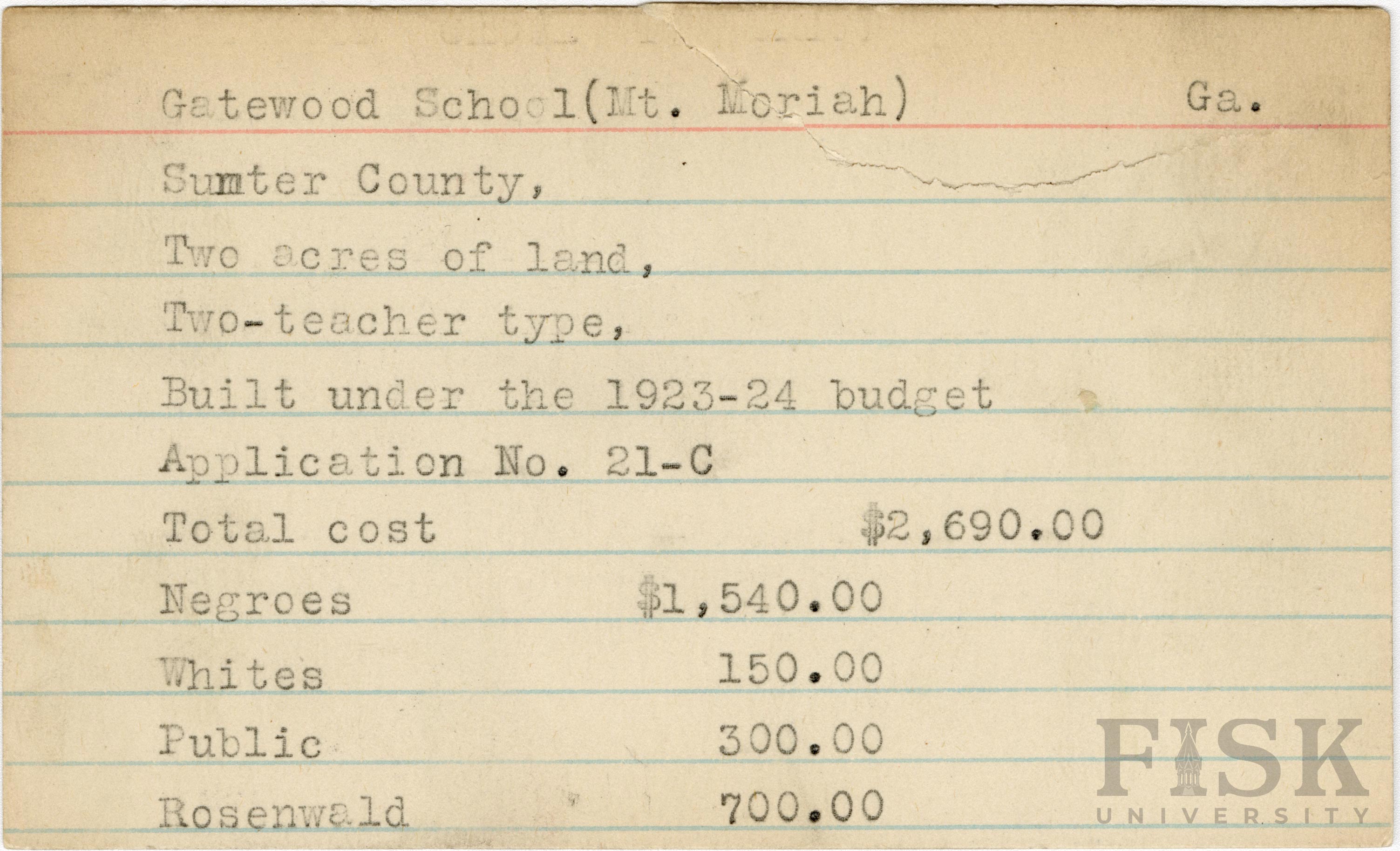 - School card from Rosenwald Fund for Gatewood School in Sumter County, Georgia